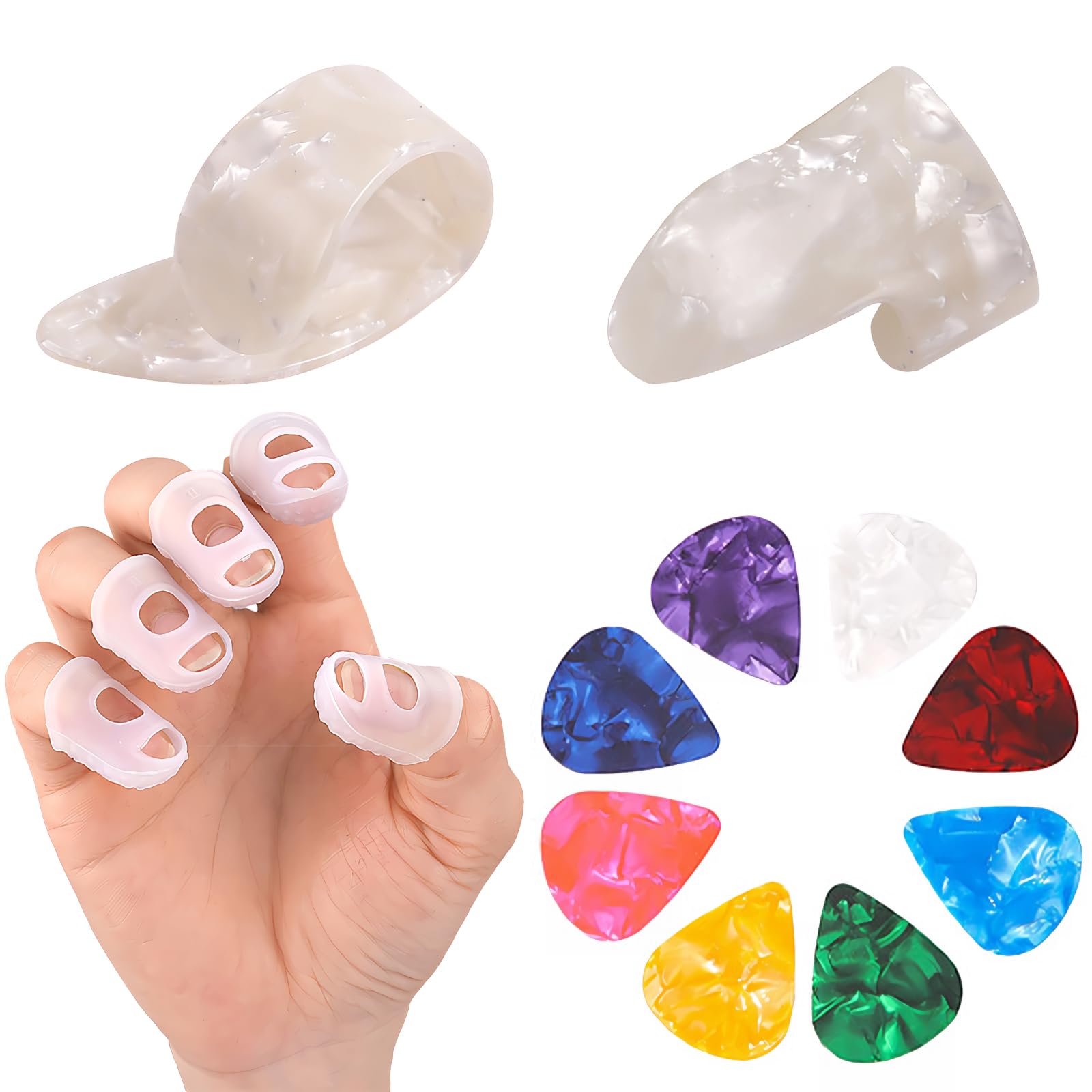 セット内容:サムピック×1枚、フィンガーピック×1枚、指サック×5個、セルロイドギターピック6種類の厚さバリエーション×6枚。
