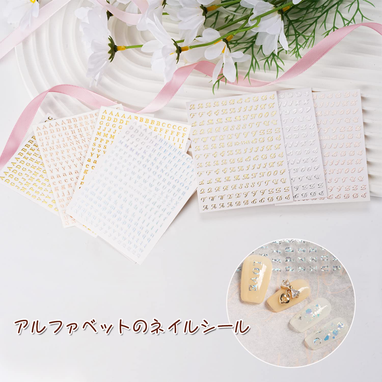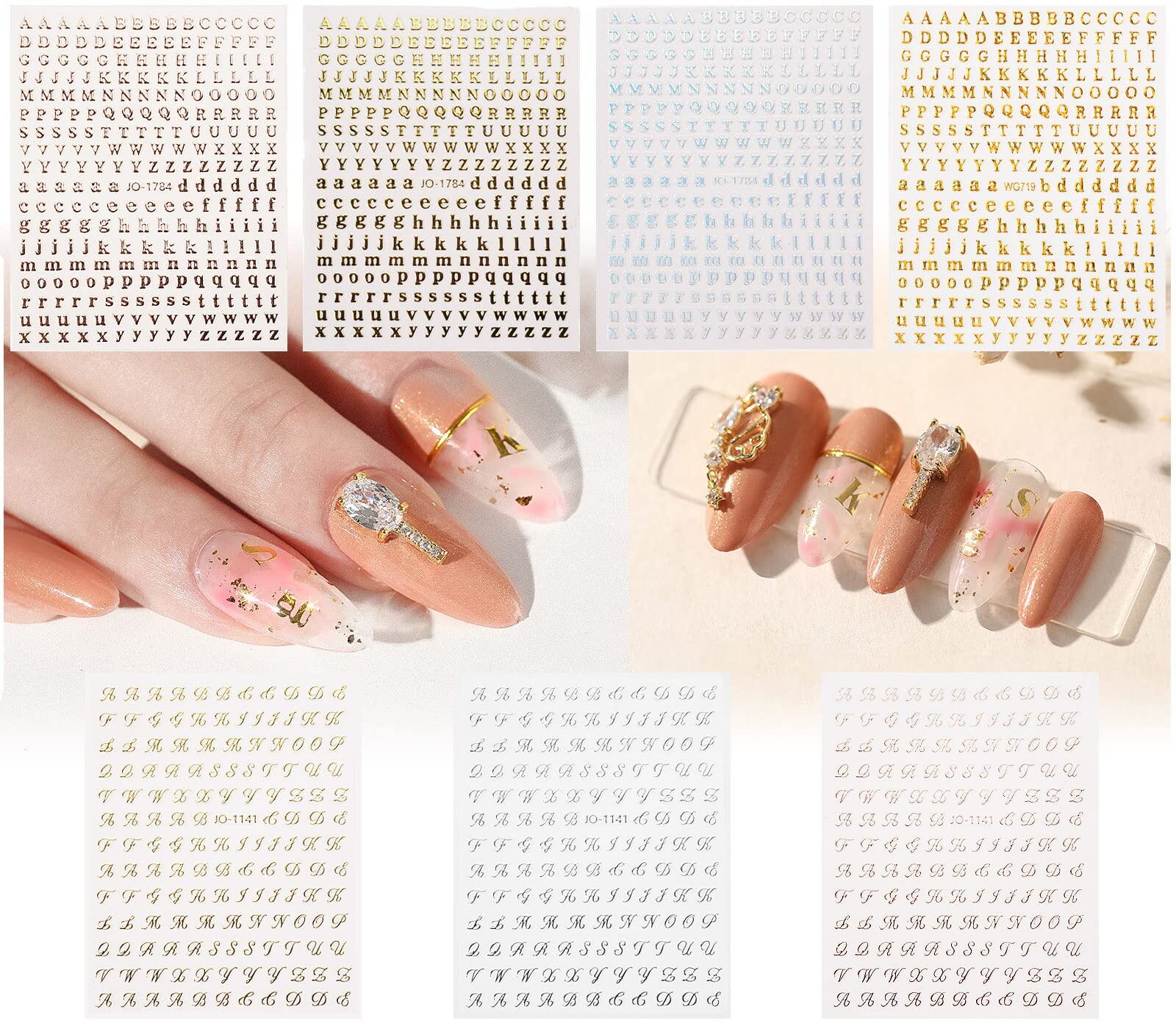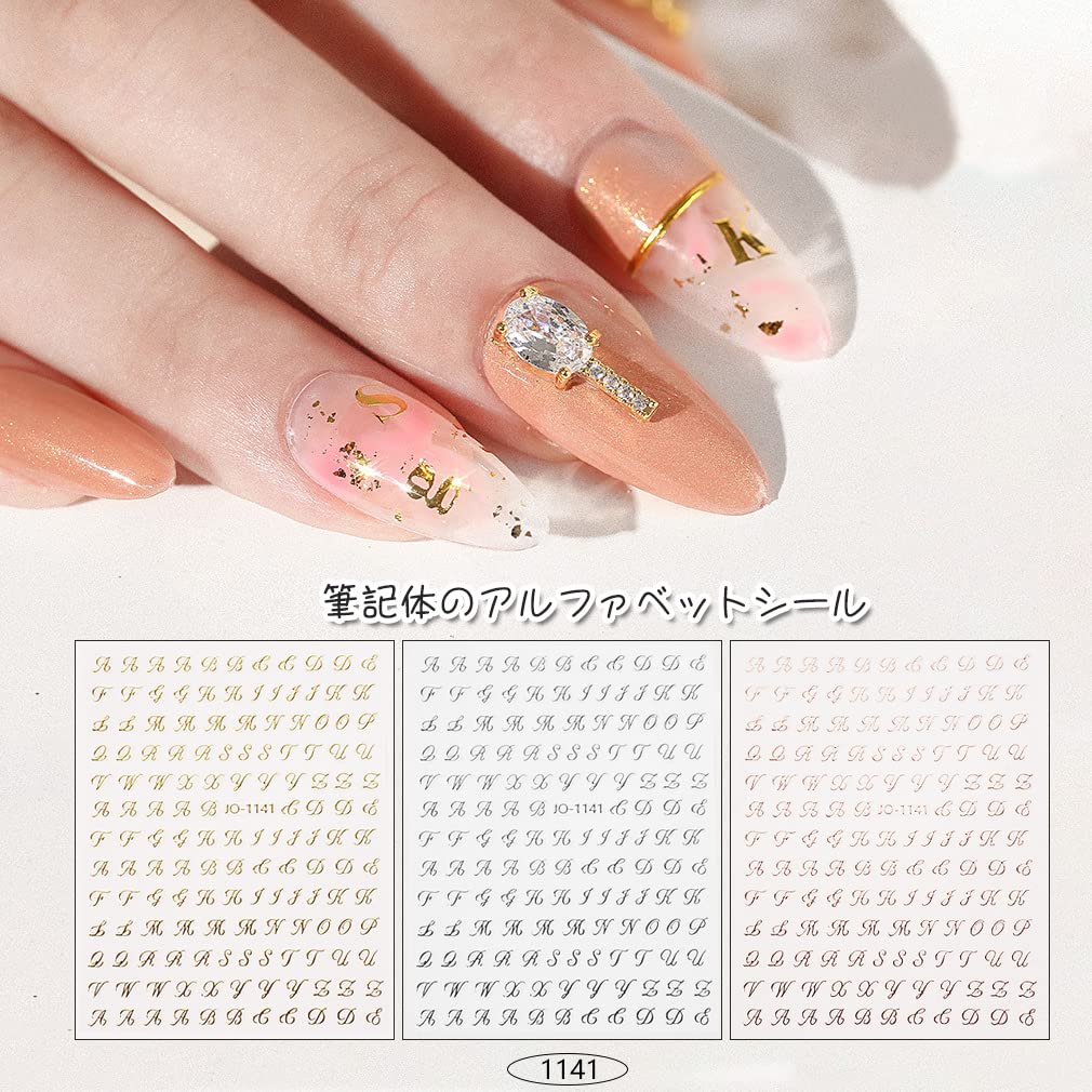 【2種類のパターン】ブロック体と筆記体の2種類のネイルシール イニシャルを含み、4色で、ニーズのため主にゴールドをご用意しています。