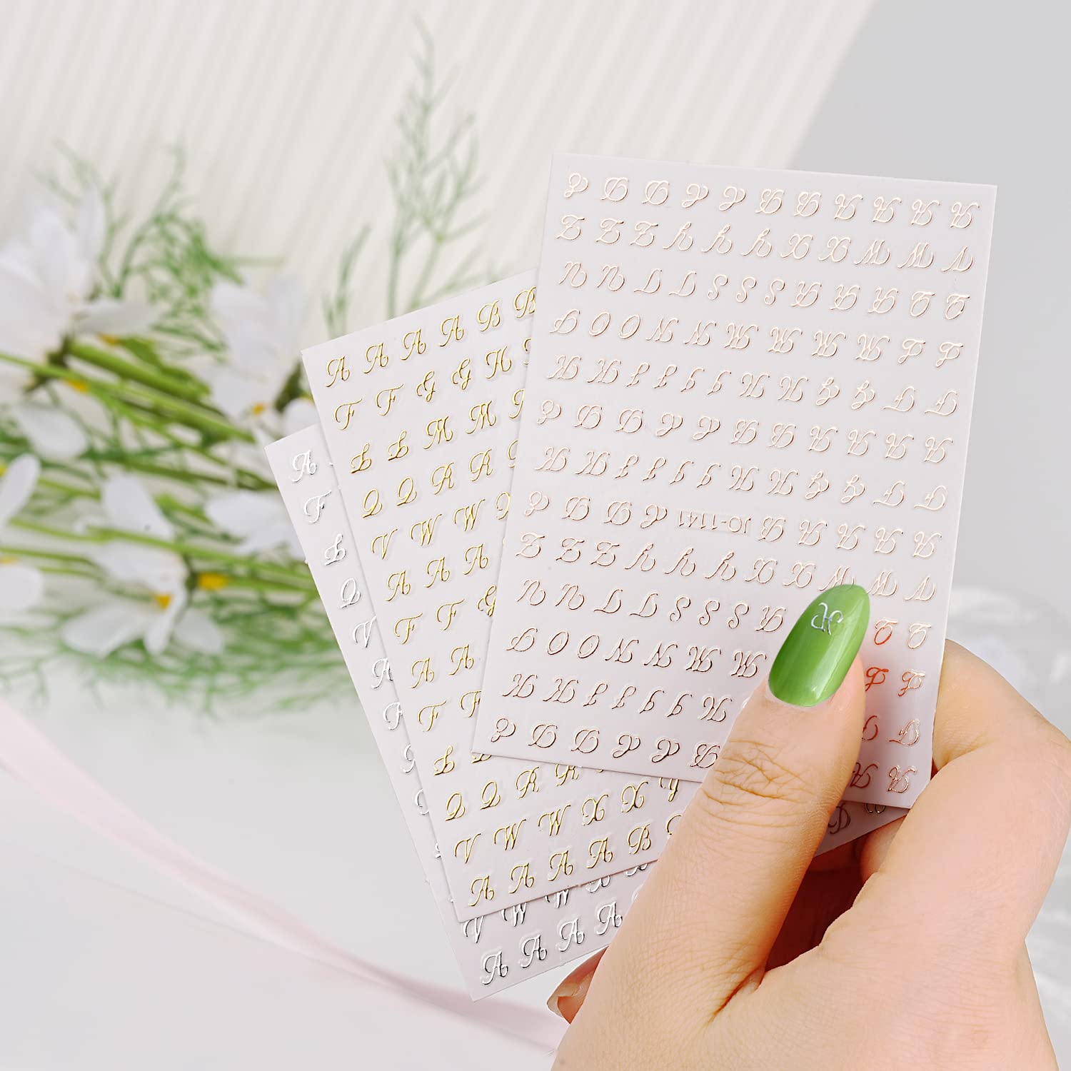 【貼るだけ】簡単で扱いやすく、ピンセットで外して爪に直接貼り付けます。ご注意:アルファベットネイルシールの粘性が強いので、優しく台紙から剥がしてください。