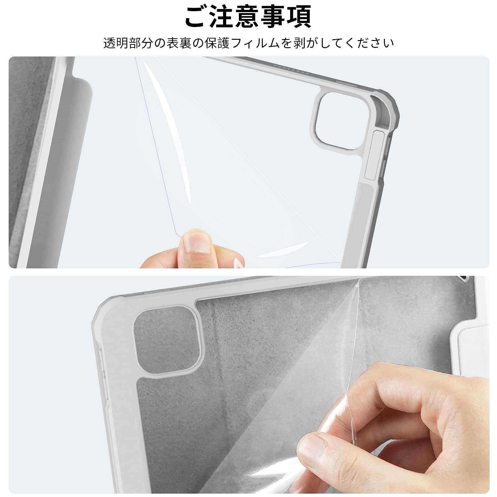 【材質&外観】ケースの表面はPUレザー素材を利用して、軽量、超薄を備えます。透明バックカバーの枠は柔軟な TPUを採用して、取り付けも簡単にできます。軽量のソフトシェル設計により、シェルの体積を増やすことなく保護を向上できます。電源ボタン、音量ボタン、スピーカー穴等、iPadを隅々までカバーし、非常に優れた保護力を発揮。(注:透明部分の表裏の保護フィルムを剥がしてください)
