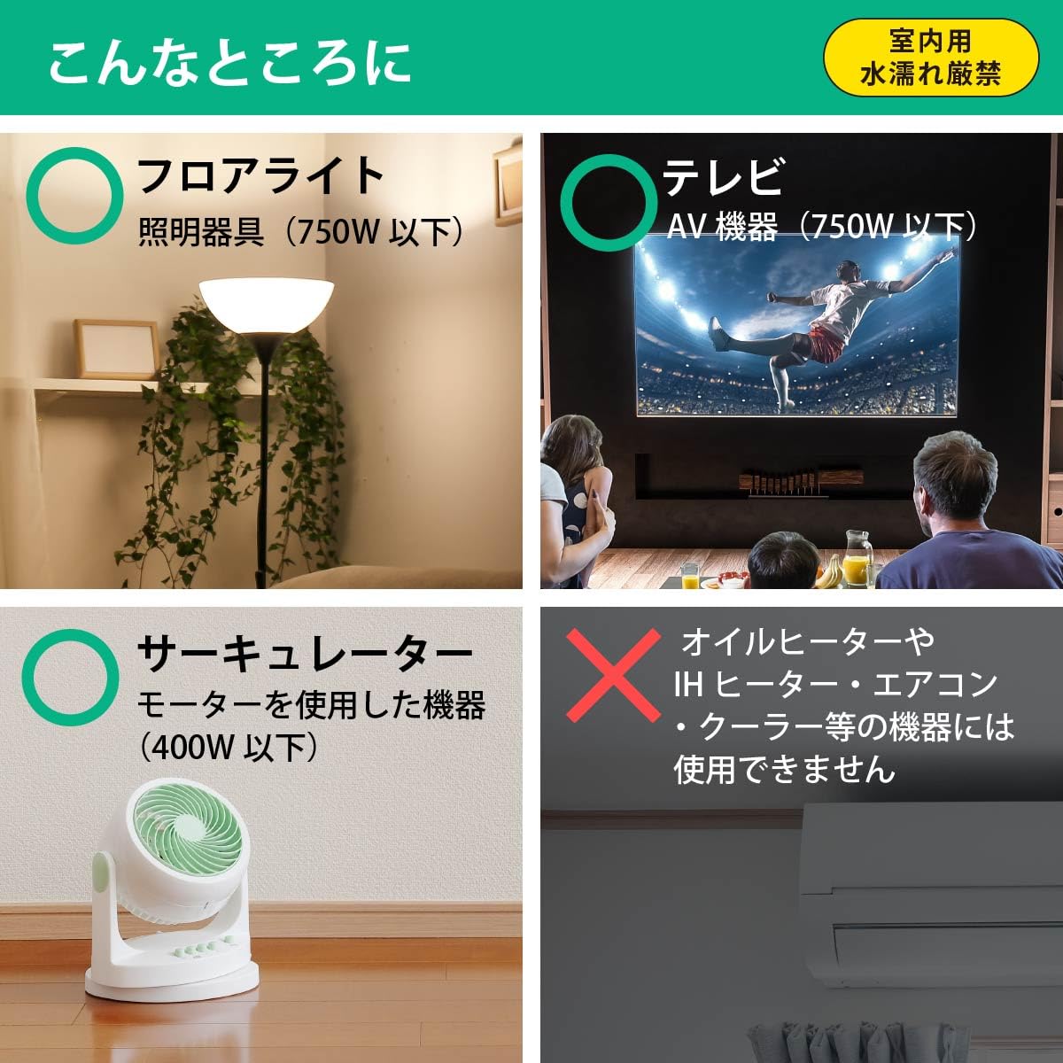 ≪ご注意≫※ 屋外や、水に濡れるおそれのある場所では、ご使用になれません。※ オイルヒーターやIHヒーター・エアコン・クーラー等の機器には使用できません。※ 使用容量は最大1500Wまで(使用する機器により、それ以下の場合があります)