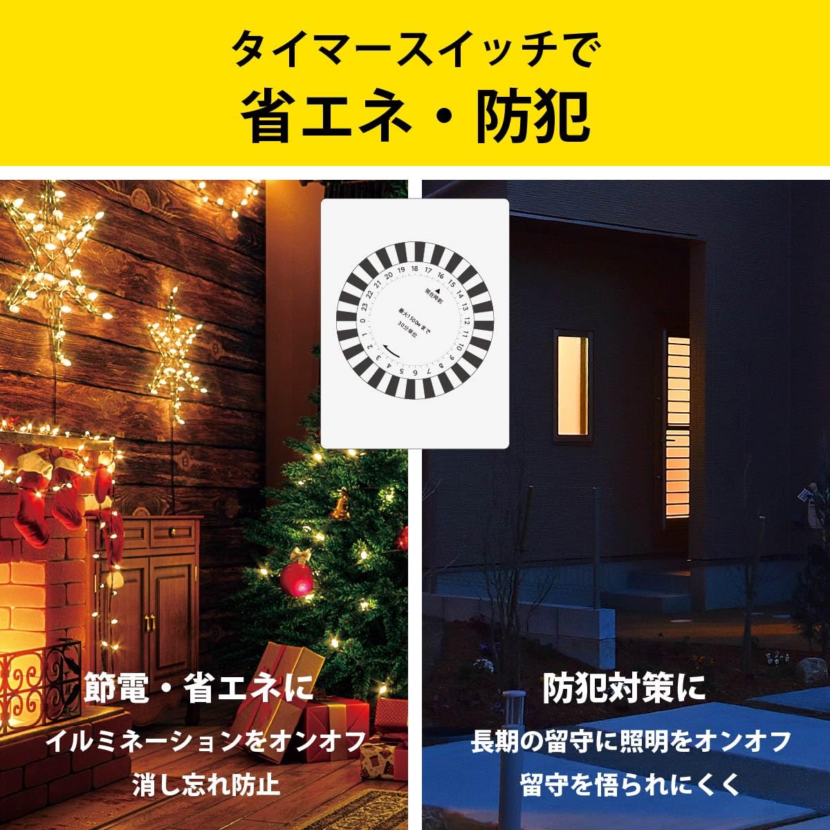 【省エネ防犯にタイマースイッチ】セットした時刻で電源をON/OFFできるので、長期不在時の防犯用ライト転倒やイルミネーションのタイマーオフなどに使用可能。