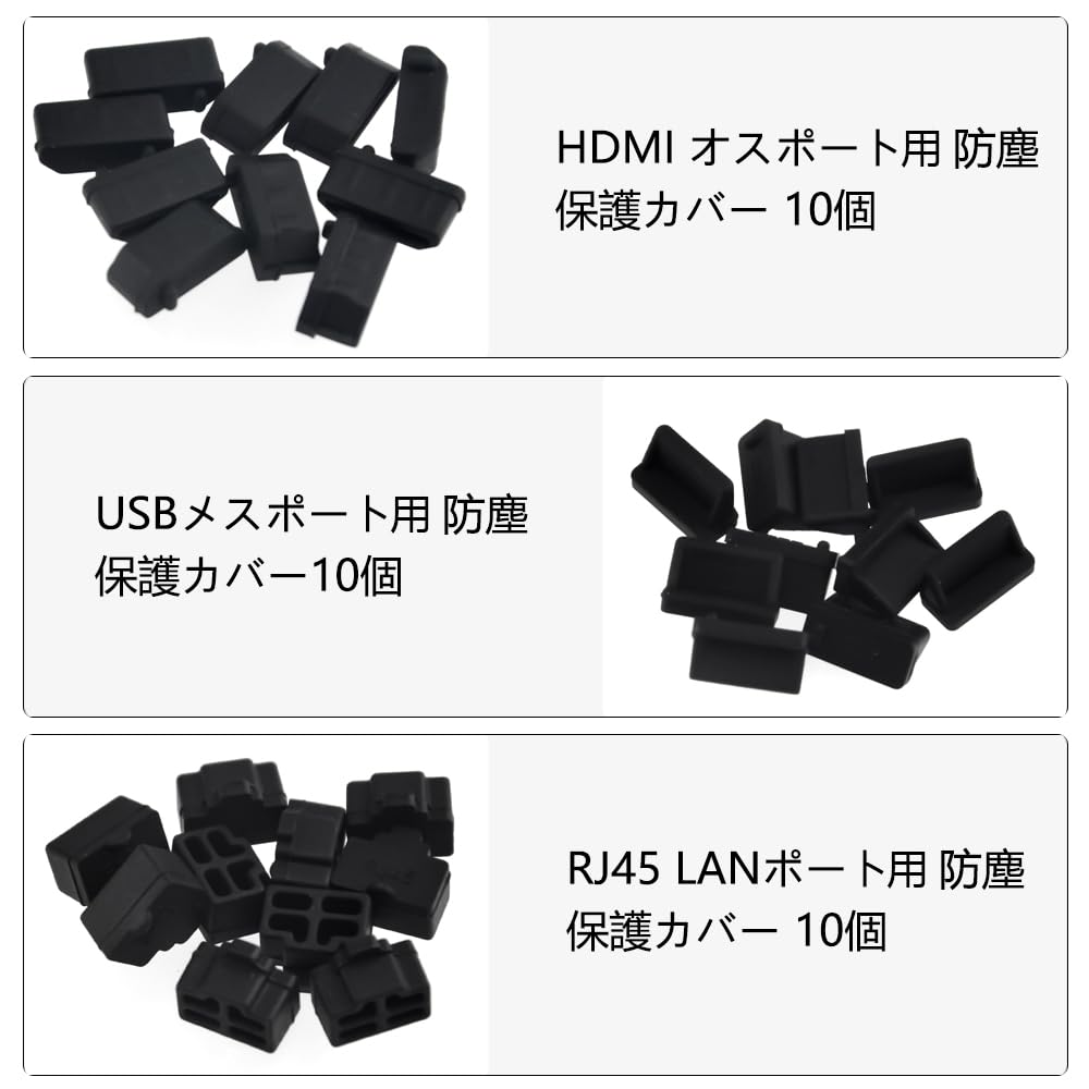 パッケージ内容:イーサネットハブポートRJ45用の10 x ダストストッパー、10 x USBポート用のダストストッパー、10 x HDMI用のダストストッパー。