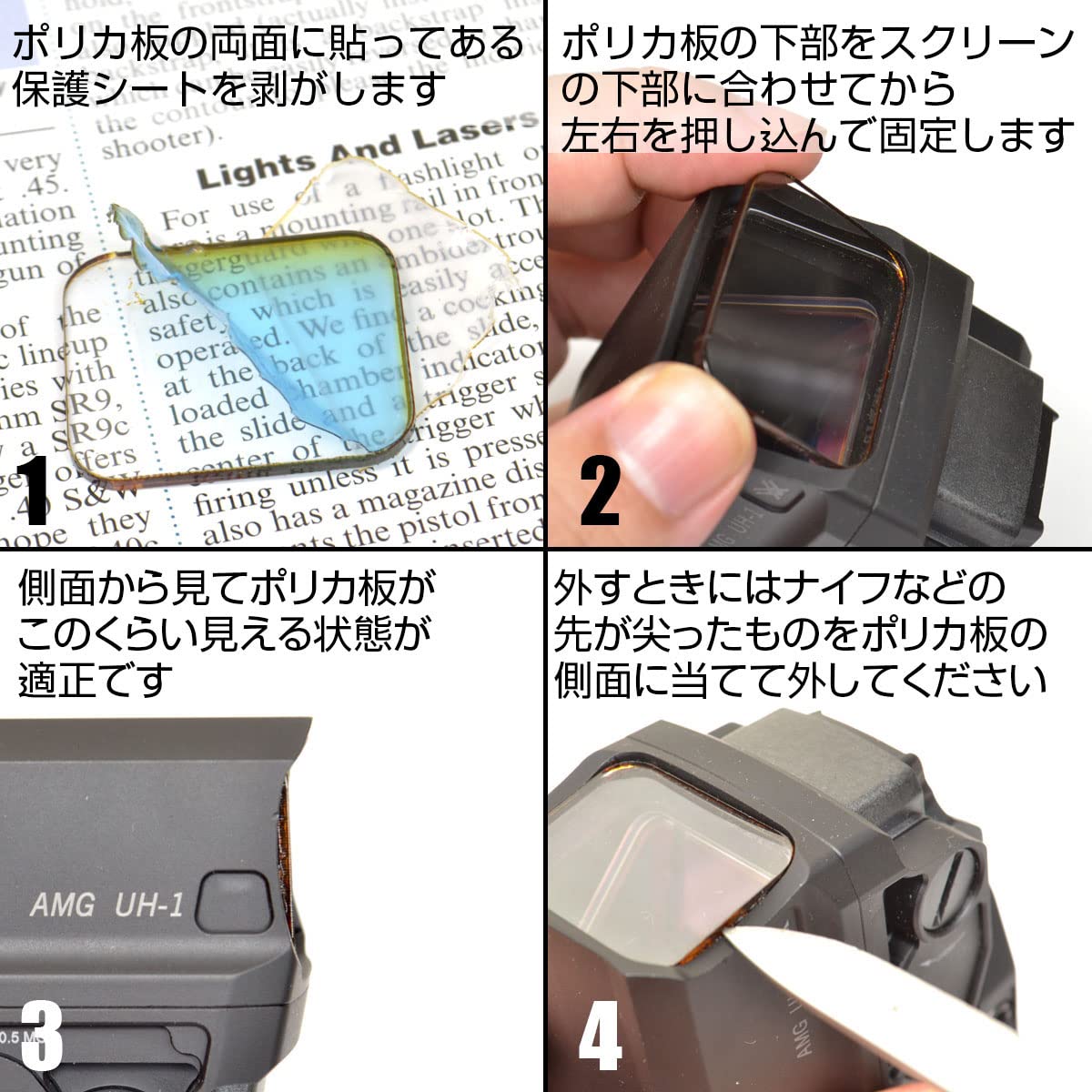 VORTEX製のUH-1 Gen2用のレンズプロテクターです。UH-1/UH-1Gen2の対物レンズは奥の方に斜めに引っ込んでいて、その前方に防御スクリーンがあります。その防護スクリーンのさらにその前方にポリカーボネート板を取り付けます。特に何もしなくても押し込むだけで十分強固に固定されますが、より確実を期すなら接着剤を少しだけ使用するといいでしょう(瞬着は白く曇るので使用不可です)。