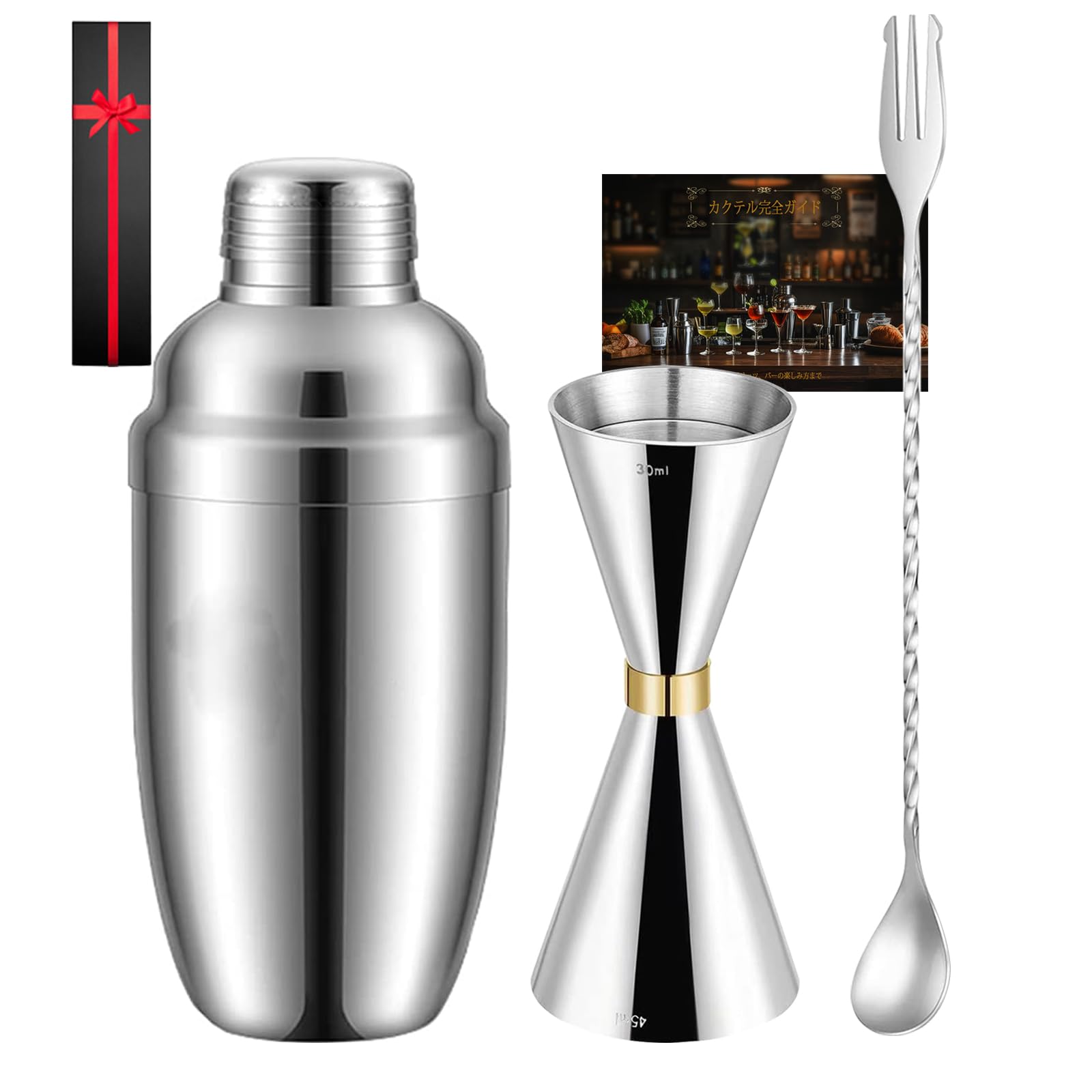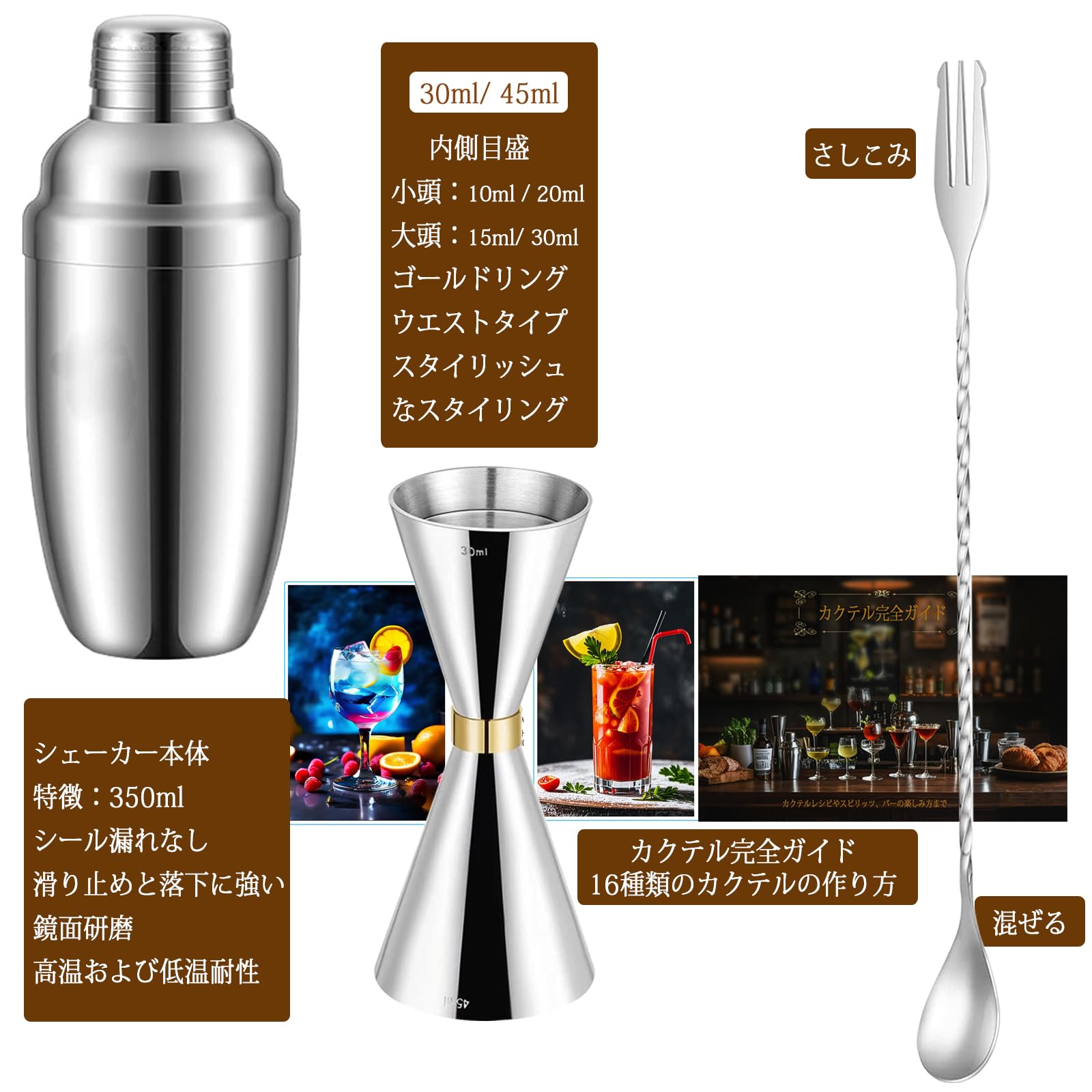 セット内容:カクテルシェーカー本体(350ml)、目盛り付き計量カップ(30ml/45ml)、バースプーン(30cm)材質:304ステンレス。 (3点バーセット)