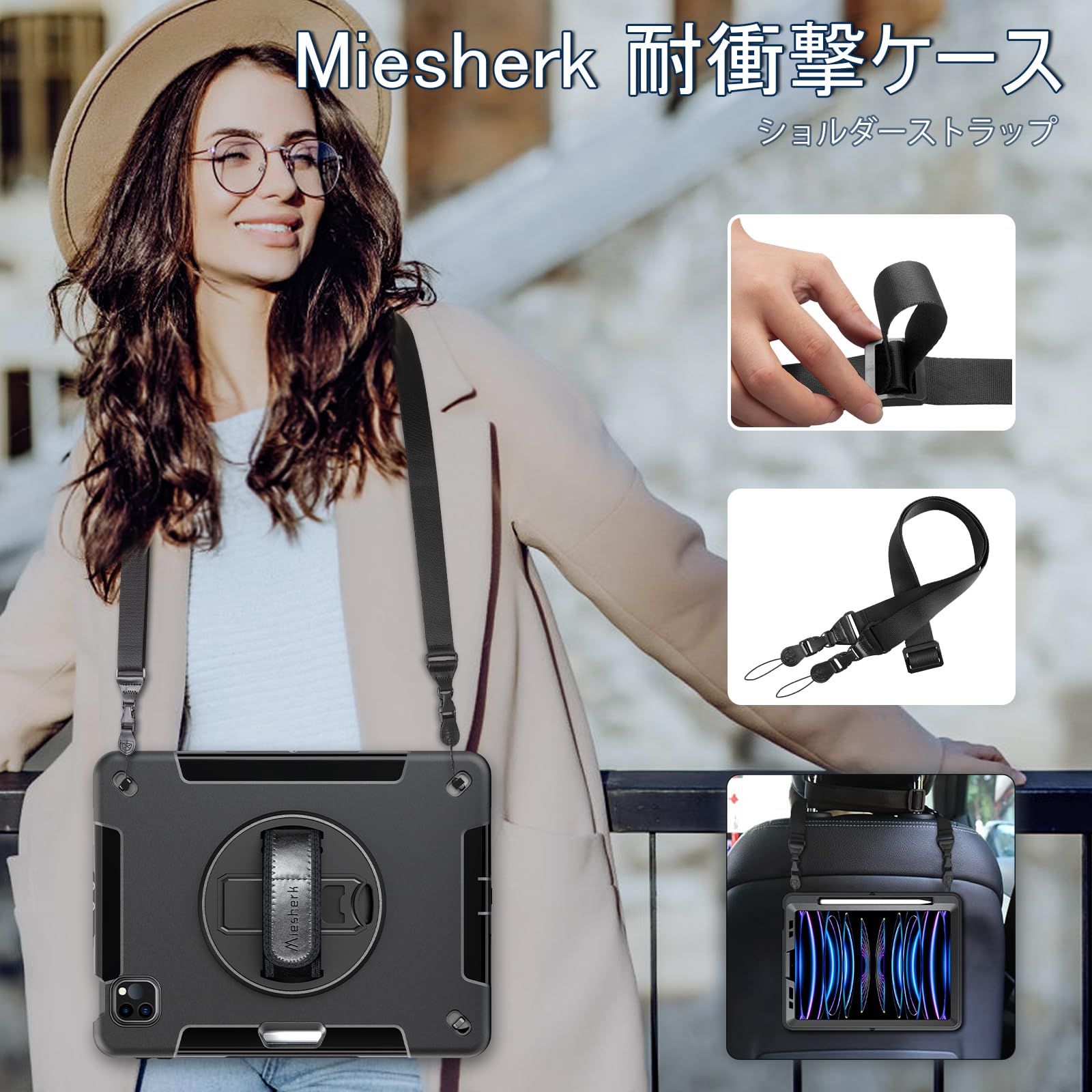 「携帯方法」このiPad Air 第5世代 カバーは二つ携帯方法、ショルダーストラップとハンドストラップがあります。ハンドストラップは自分手のサイズが自由に調整できます。肩紐は車椅子にも使いできる。仕事、現場、旅行、子供勉強など幅広い場合が通用できます.