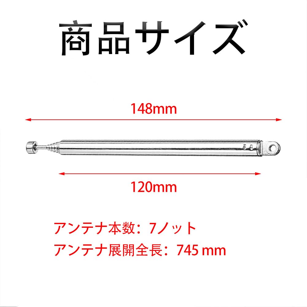 1.【7段伸縮アンテナ】インピーダンス:75Ω、アンテナ長さ:14.8cm〜74.5cm、取付穴径:2.5mm 2.【高品質】ステンレス鋼と真鍮製の伸縮式アンテナ、破損したテレビとFMラジオ受信アンテナのための偉大なアンテナ交換部品。 3.【インストールが簡単】折りたたみ伸縮式アンテナは、インストールが非常に簡単です、プラグアンドプレイ、あなたがより良い信号を得るのに役立ちます。 4.屋内携帯用ラジオ、FM のラジオ、家のステレオの受信機、AV の可聴周波ビデオ ホーム シアターの受信機、TV のコンバーター箱、TV のチューナーの受信機と互換性があ。 5.家およびオフィス GSM の警報システム、無線センサーの行動探知機警報、リモート・コントロールおもちゃモデル、頻度メートルのカウンターと互換性がある。