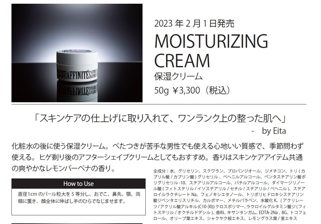 保湿クリーム 50g メンズ 男性 高保湿 日本製 保湿 メンズコスメ 「スキンケアの仕上げに取り入れて、ワンランク上の整った肌へ」by Eita スキンケアの仕上げとなるクリームを使えば、朝も夜も肌のかさつきを防ぎ、いつでもしっとり肌を演出する。 affinites アフィニテ クリーム ブランド AFFINITES 商品の形状 クリーム 特徴 うるおいを与える 商品の重量 50 グラム 商品の個数 1