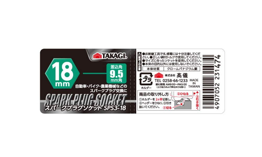 髙儀(Takagi) 高儀 TAKAGI スパークプラグソケット 9.5mm角 18mm SPS3-18 自動車・バイク・農業機械などのスパークプラグ交換に 差込角:9.5mm角 本体材質:クロームバナジウム鋼 本体サイズ:25×64×25mm 本体重量:135g ●自動車・バイク・農業機械などのスパークプラグ交換に●サイズが見やすく一目でわかる