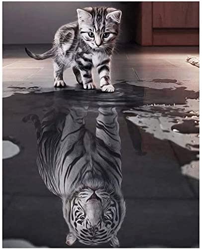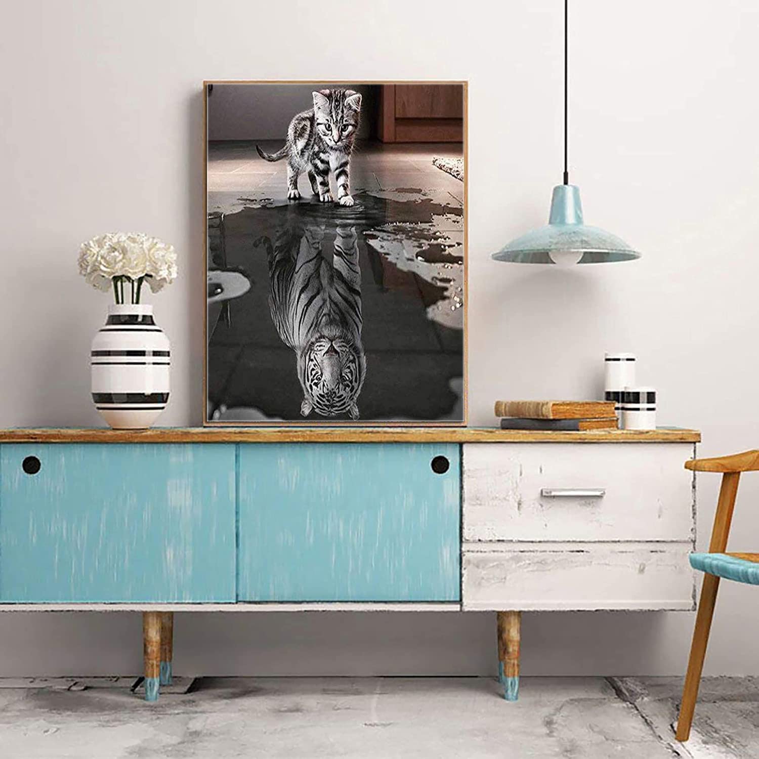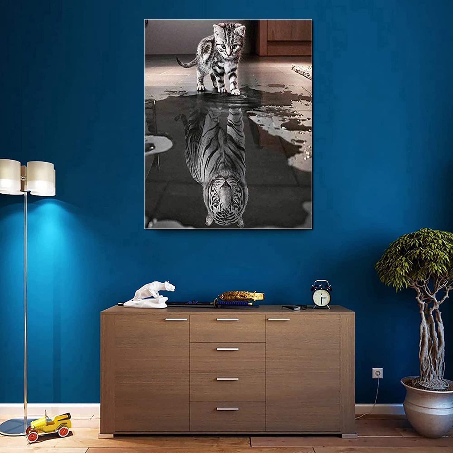 ??【独特の美しさとファッションデザイン】:猫と虎の反射は素晴らしいヒントと斬新な意味を持っています。 5Dダイヤモンド絵画は、リビングルーム、ベッドルーム、オフィス、ダイニングルーム、バー、その他の壁に適した、長年保存できます。