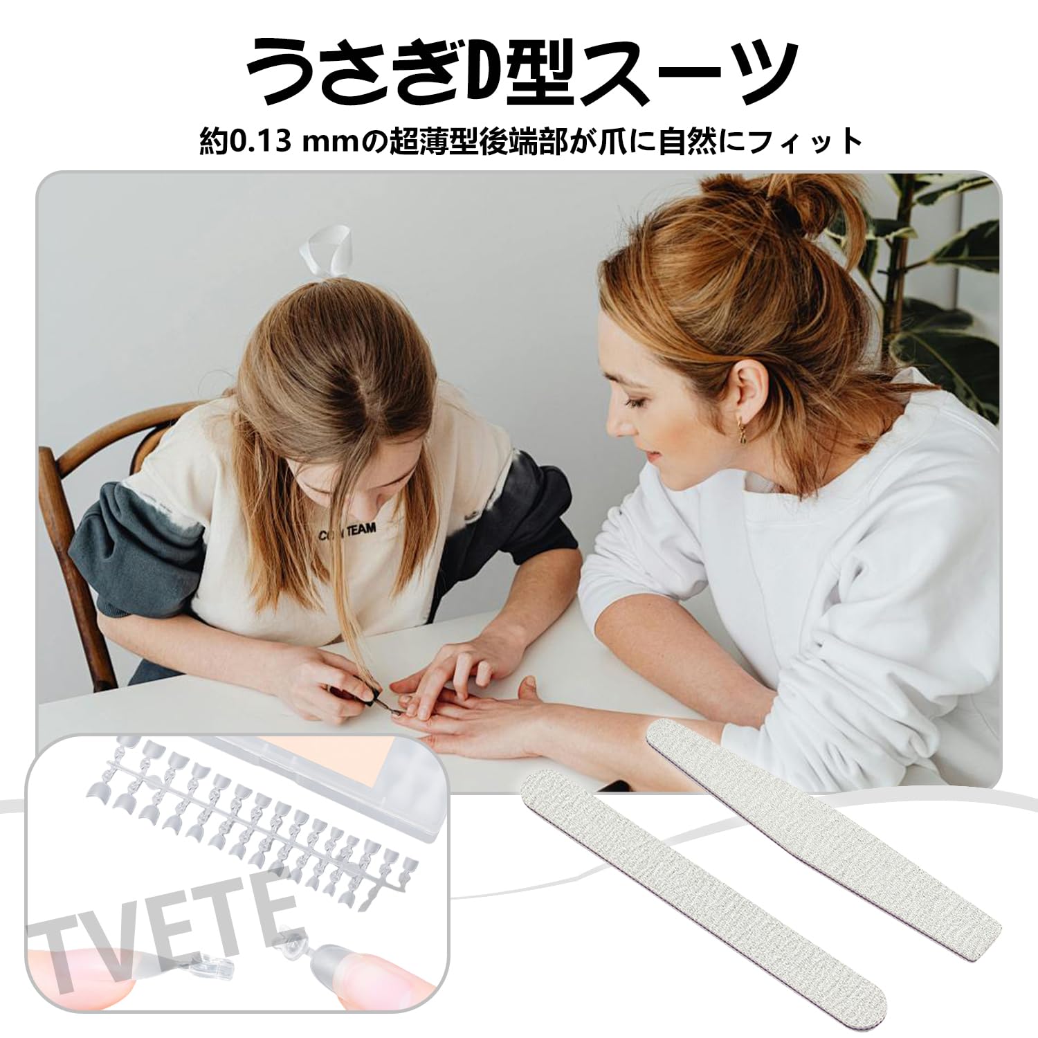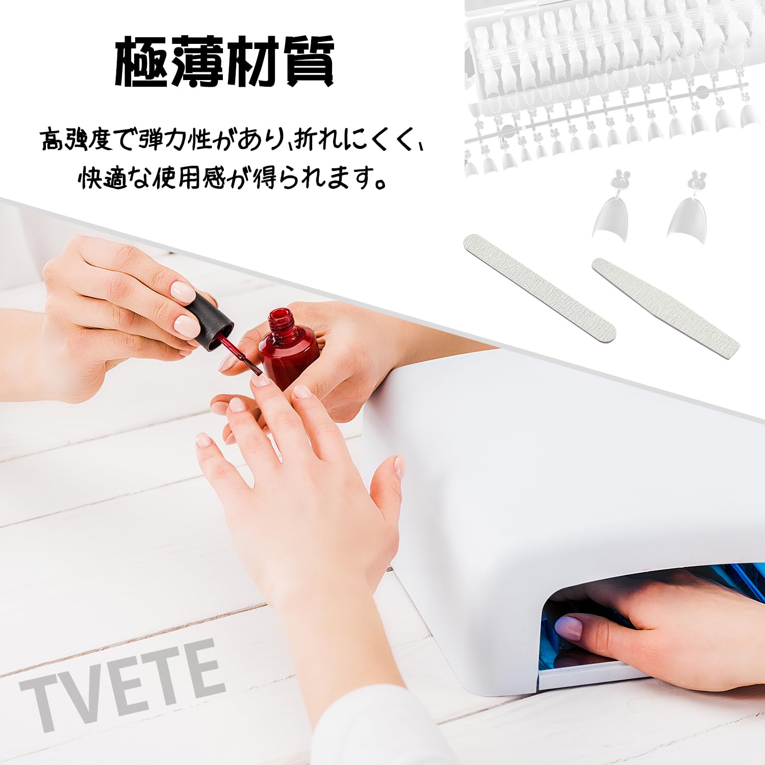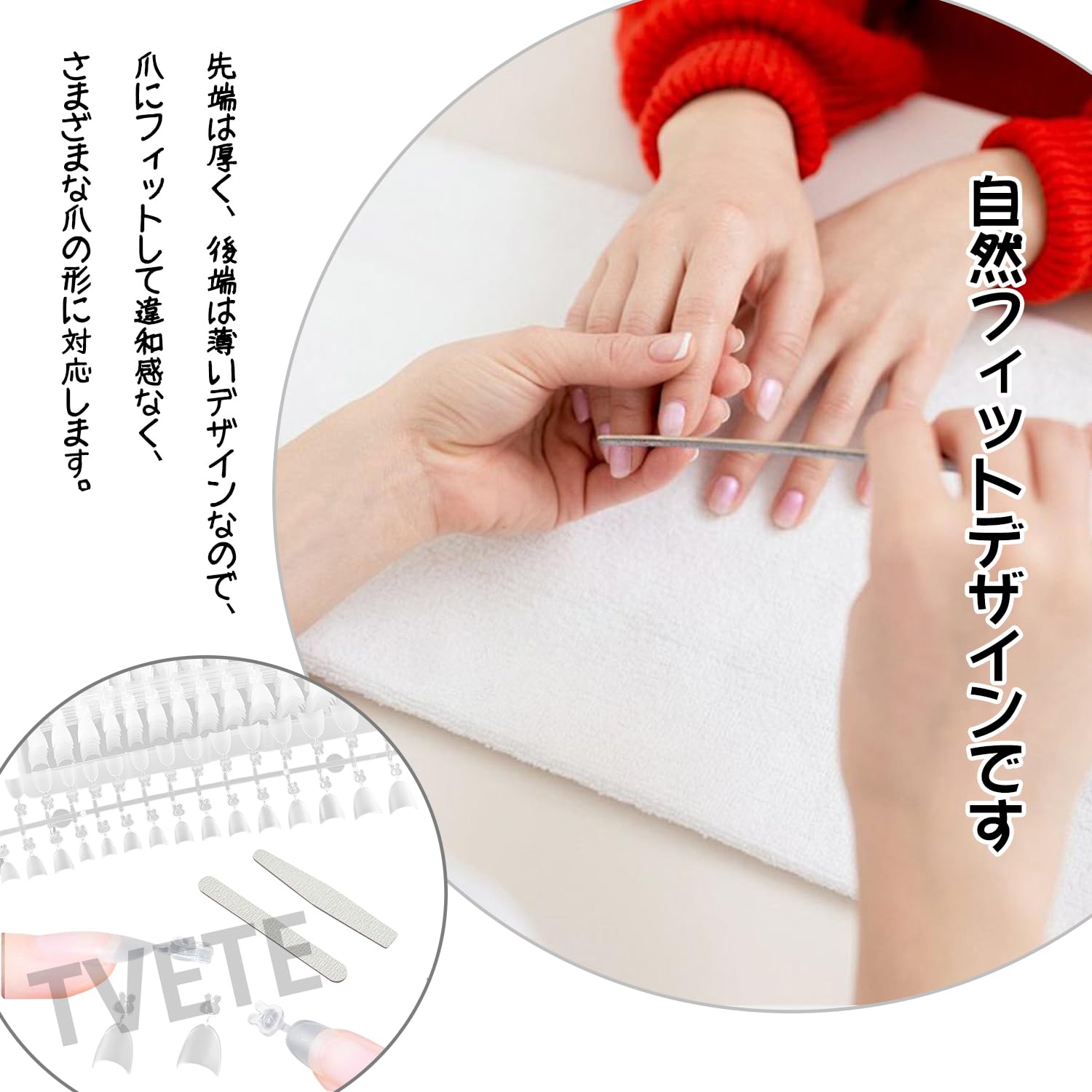 【豊富な12サイズ展開 大容量300枚入り】12種類の豊富なサイズ展開で、どんな爪の形にも対応。自分の爪にぴったりのサイズを見つけることができます。左右の爪の大きさが異なる場合でも、それぞれに合ったサイズを選べるので安心です。たっぷり使える300枚入り。(6号、7号、8号はそれぞれ40枚ずつ入っております。)おまけとして、両面仕様ネイルファイルを2本同梱。(100/180サンドペーパー)プロ仕様の耐久性があり、繰り返し使える高品質設計。ネイルチップの装着前後の微調整に大活躍する、嬉しい付属品です。
