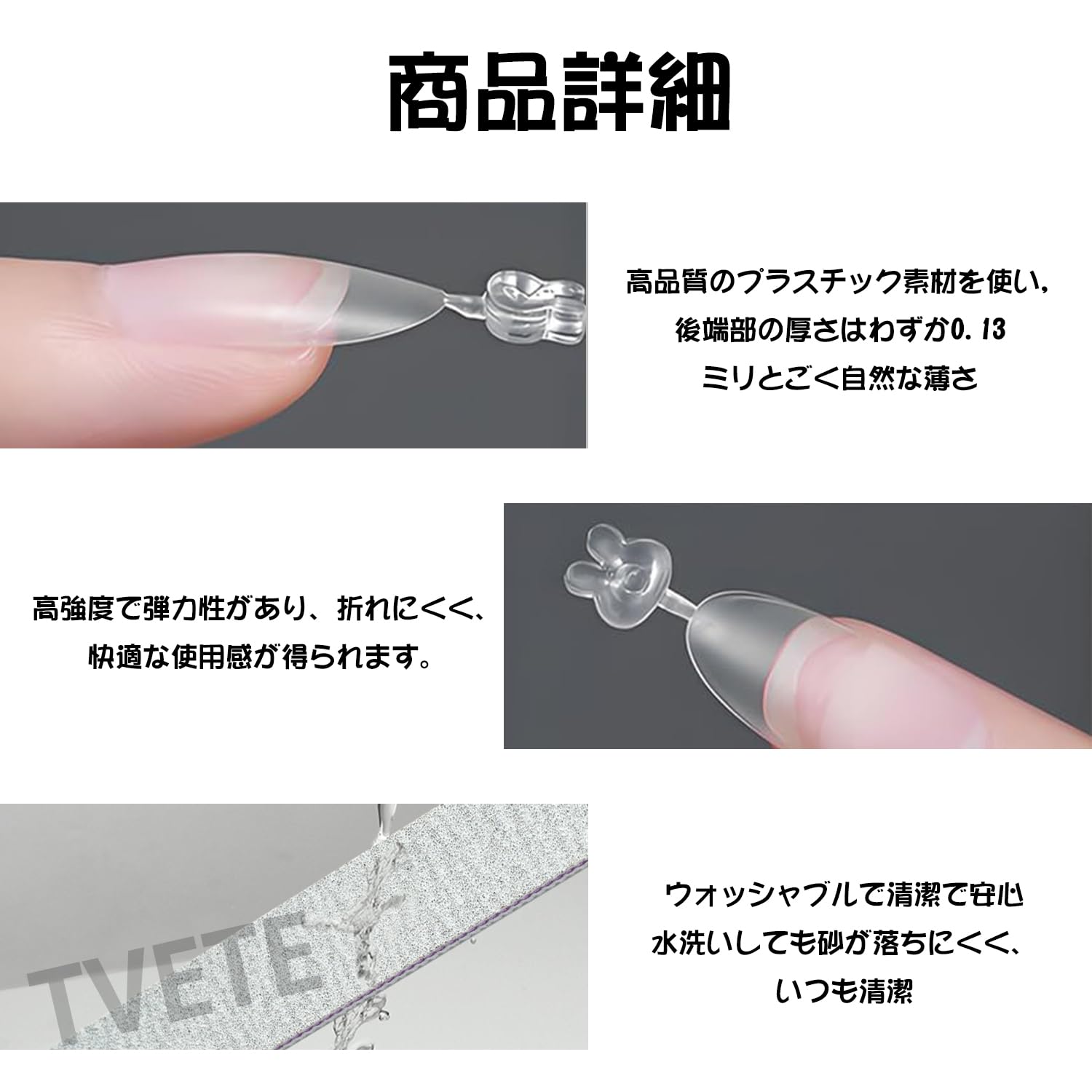 【キュートなウサギ型ハンドル付き】可愛らしいウサギ型ハンドルが付属。ネイルチップの取り扱いが格段に楽になります。見た目も可愛く、使うたびに気分が上がります。全てのネイルチップには番号が振られており、自分の爪に合うサイズを簡単に見つけることができます。