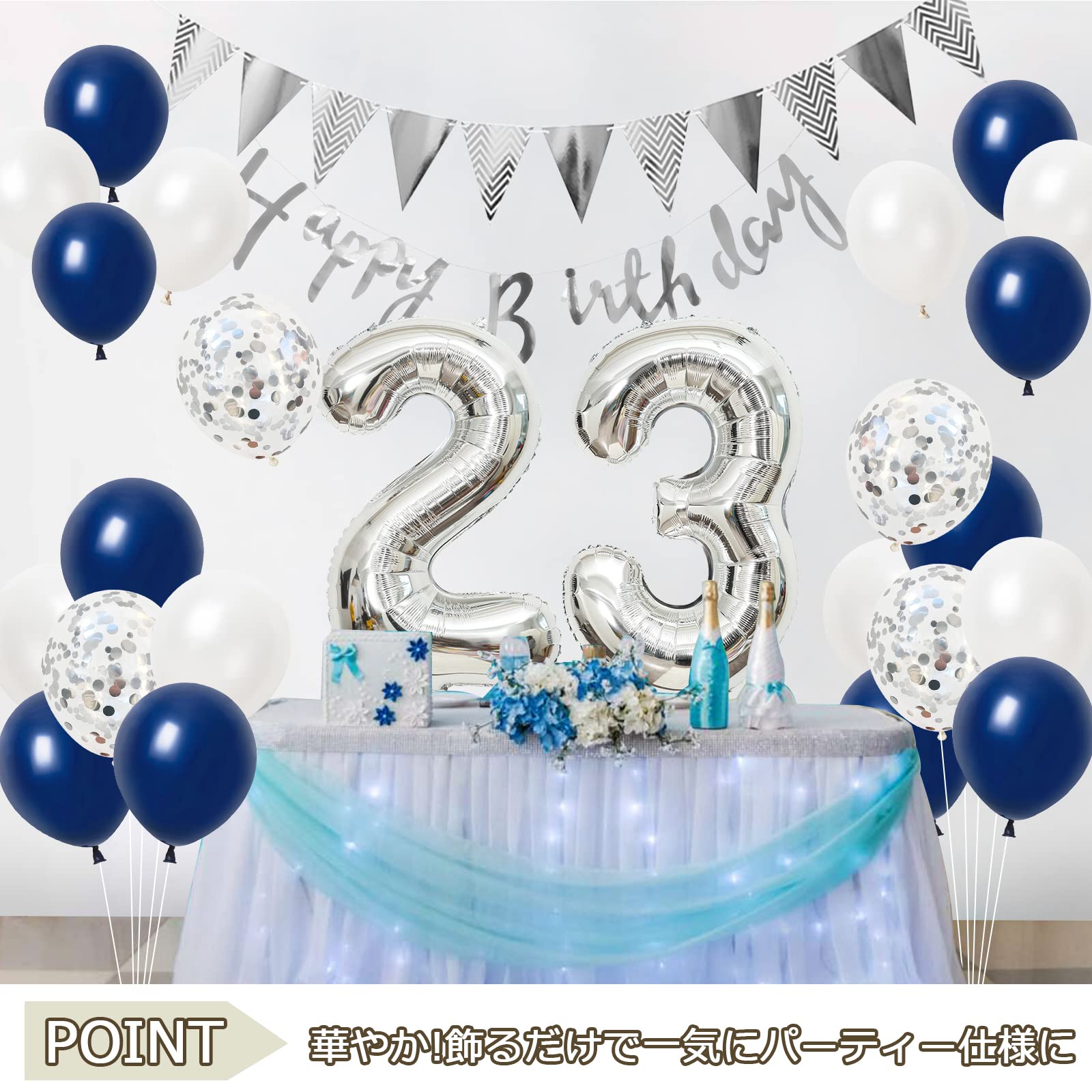 〔23歳の誕生日のお祝いに!〕大人のバースデー向けの飾り付け用のバルーンセットです。ビッグな数字風船がポイントで、ガーランドとゴム風船の定番組み合わせ、ブルーのカラーがシックで大人っぽくおしゃれで、飾るけでお部屋の雰囲気がガラッと変わります。お友達や大切な人の誕生日のサプライズを素敵にを演出しよう!
