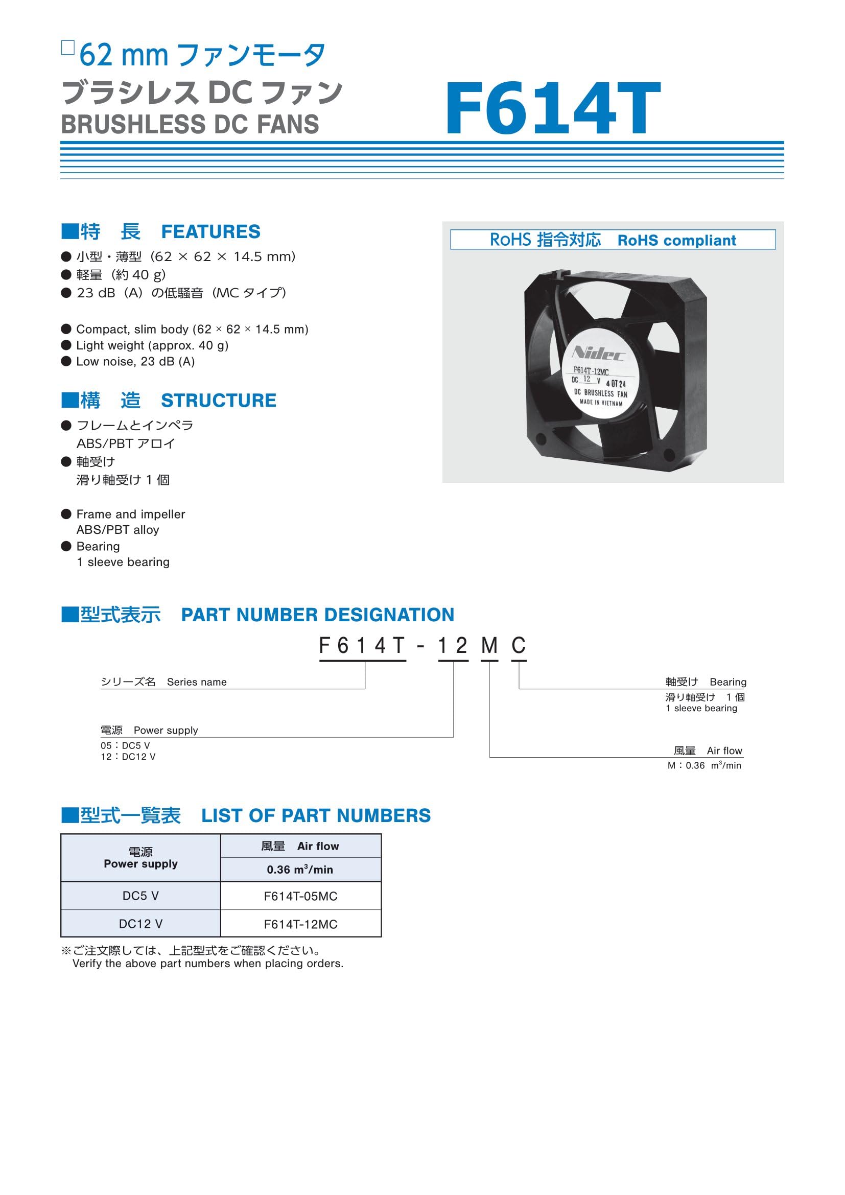 F614T-05MC 5V 62mm角ファンモータ Nidec(ニデックプレシジョン/旧日本電産コパル) 定格電圧(V):5 使用電圧範囲(V):4.5〜5.5 定格電流(A):0.10 回転数(rpm):2,900 風量(m3/min):0.36 静圧(Pa):20