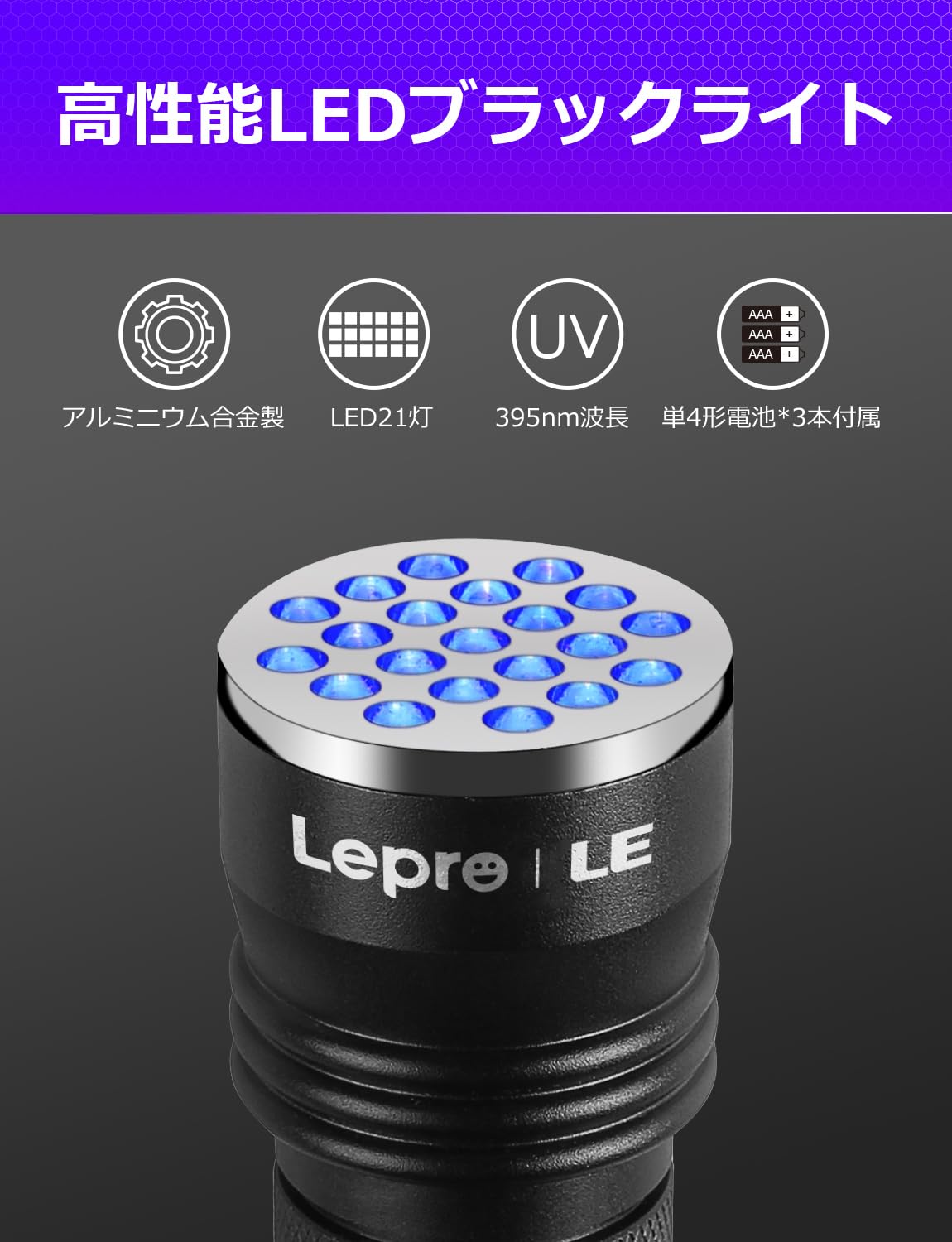 【在庫のみ】Lepro ブラックライト uvライト 釣り レジン用 紫外線 硬化 21LED UV 懐中電灯ブルー アルミ合金材質 単4形電池付属 uvレジン ペットのオシッコ汚れを発見 目には見えない汚れに対策に