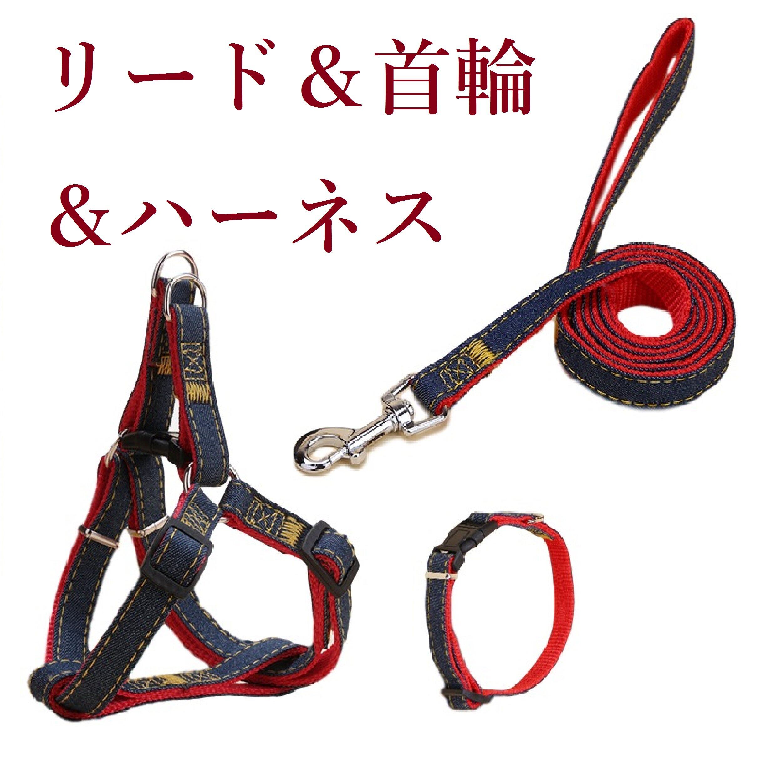 【数量限り】(DauStage) ハーネス リード 首輪 セット デニム 素材 選べる 4色 4サイズ 小型 中型 大型 犬用 トートバッグ付き (S レッド)