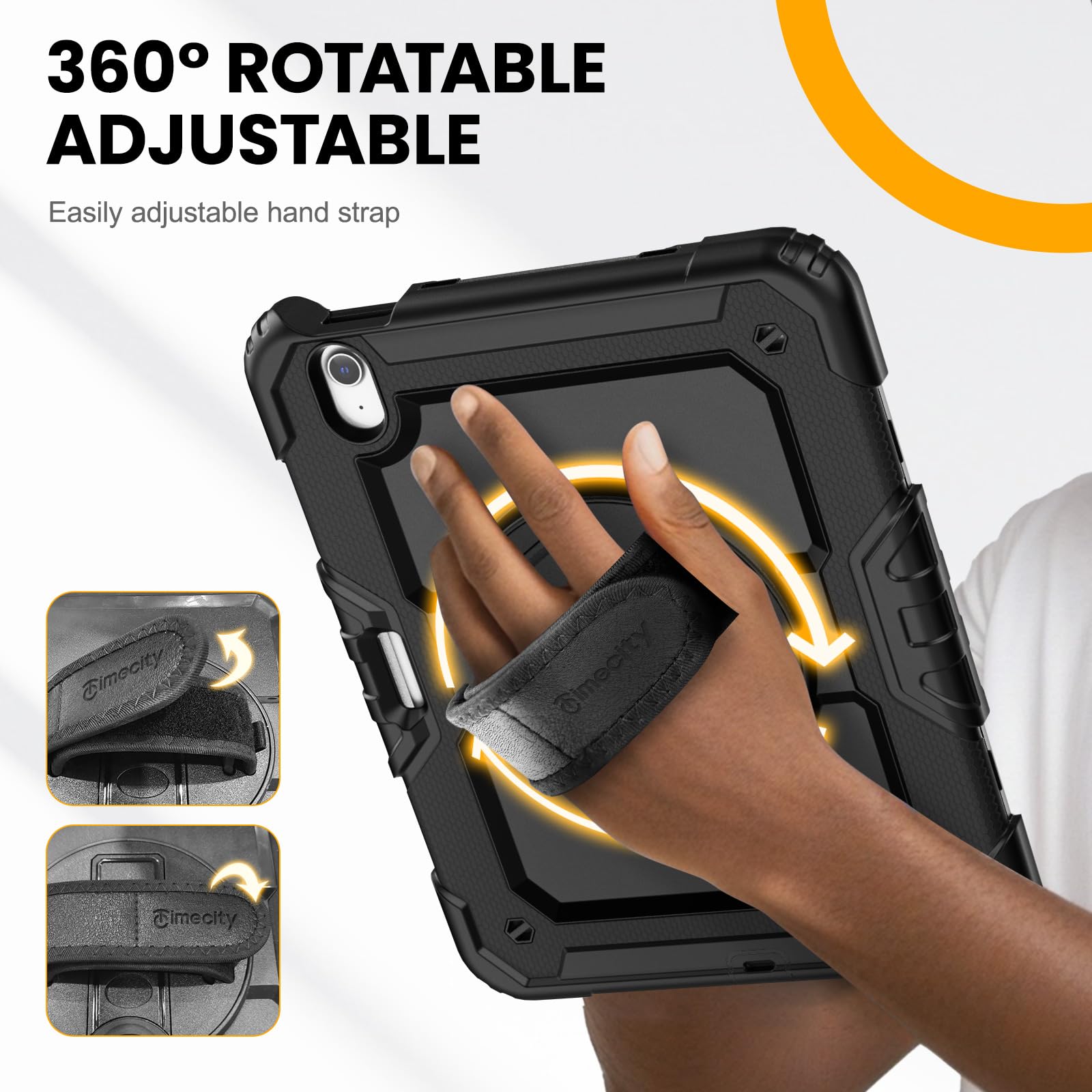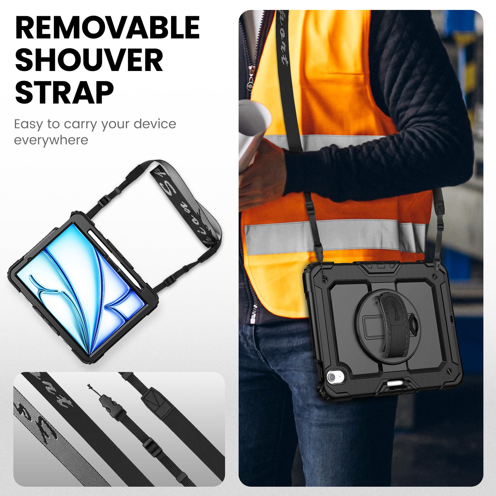 【特価処分】Timecity iPad Air 11インチ ケース (2025新モデル) 耐衝撃 三層保護 360回転スタンド 保護フィルム ハンド&ショルダーストラップ ペン収納付き 仕事 現場 傷防止 頑丈 2025/2024 iPad Air11インチ ケース M3/M2チップ 保護カバー (ブラック)(適格請求書発行可能)