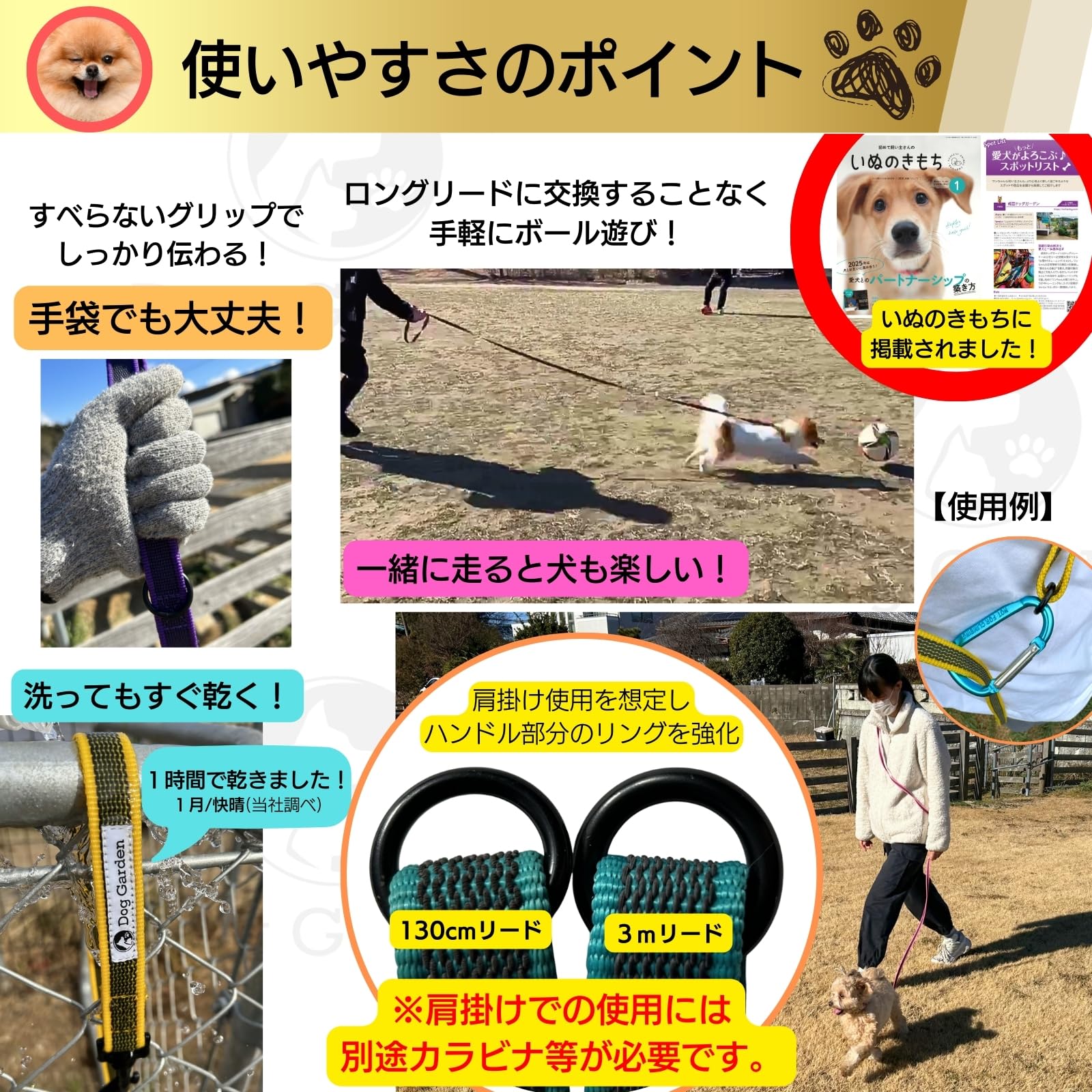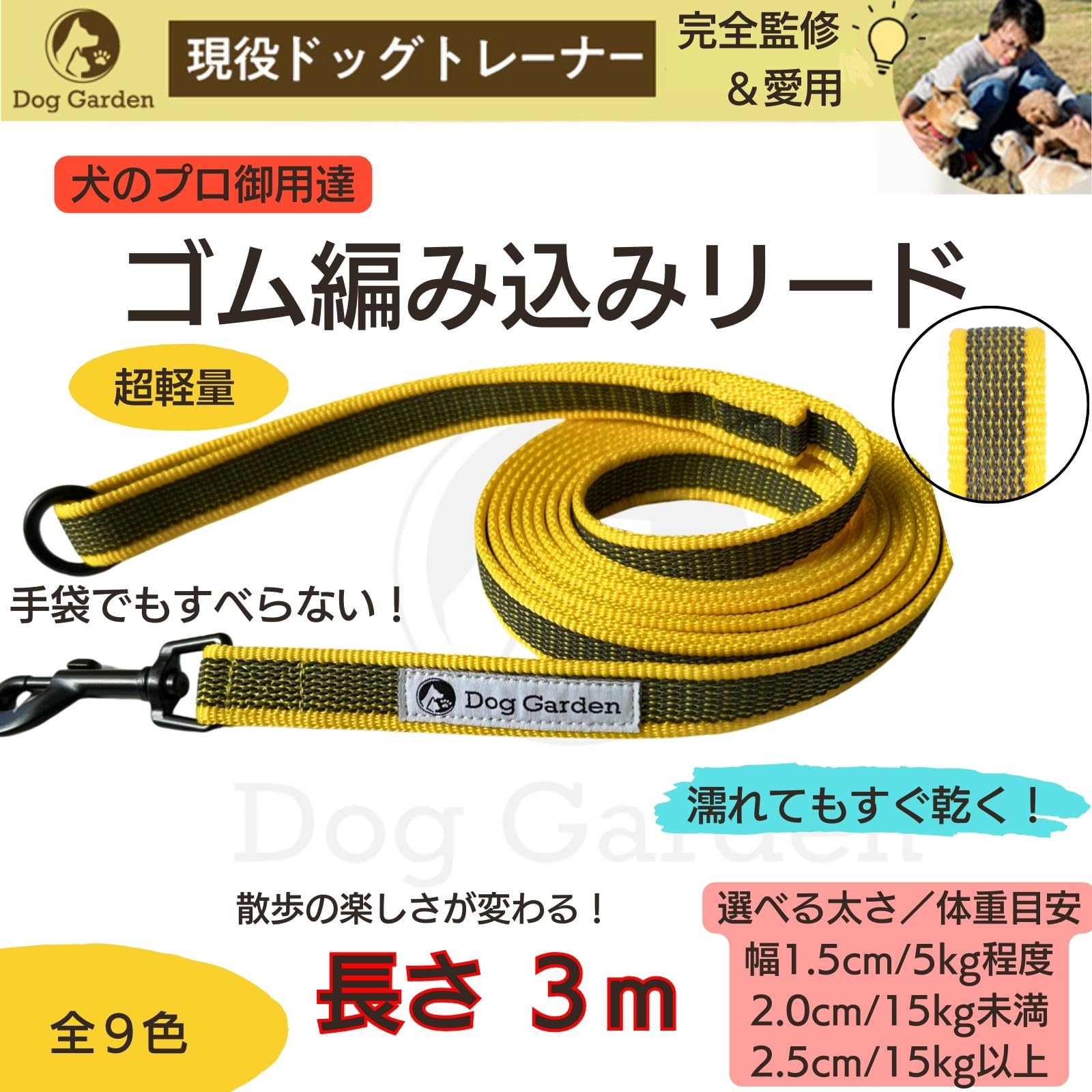 【在庫のみ】DogGarden すべらないリード 3m 小型犬用 肩掛けリード 呼び戻し練習 軽い 洗える すぐ乾く (イエロー リード幅1.5cm)