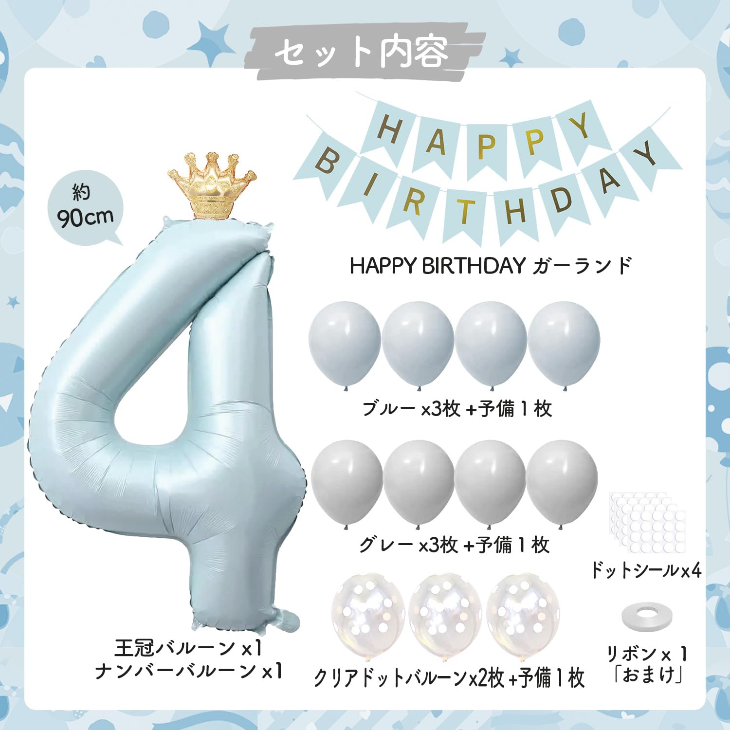 【飾りセット内容】①ナンバーバルーンx1(高さ90cm) ②ミニ王冠バルーンx1③HAPPY BIRTHDAY ガーランドx1「紙製」 ④ブルー風船x4(3+予備1)⑤グレー風船x4(3+予備1)⑥クリアドット風船x3(2+予備1)⑦リボンx1「おまけ」⑧ドットシール「おまけ」※ペタンコの状態でお届けです。※ロットにより若干色味に差が出る場合がございますので、ご了承ください。