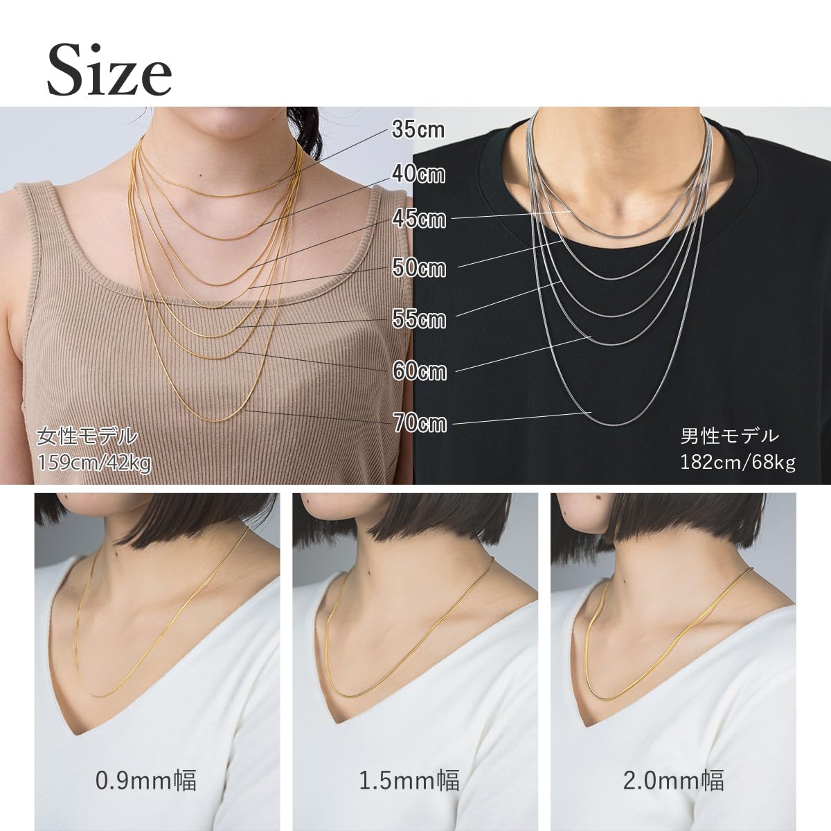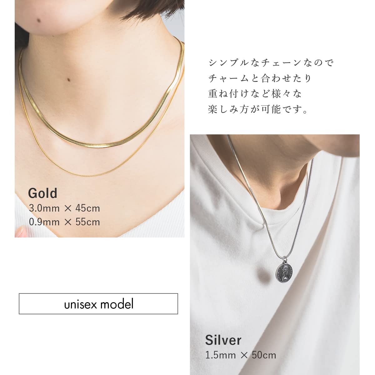 【バリエーション豊富】チェーン幅が0.9mm,1.5mm,2mmの3種類、チェーンの長さが35,cm40cm,45cm,50cm,55cm,60cm,70cm、カラーがシルバー、ゴールド、ピンクゴールドの3色の計50種類からお選びいただけますので貴方のお気に入りがきっと見つかります。シンプルに着用したり、2,3本重ねて着けたりお手持ちのチャームなどと合わせてみたりとお好みのスタイルでお楽しみいただけます。