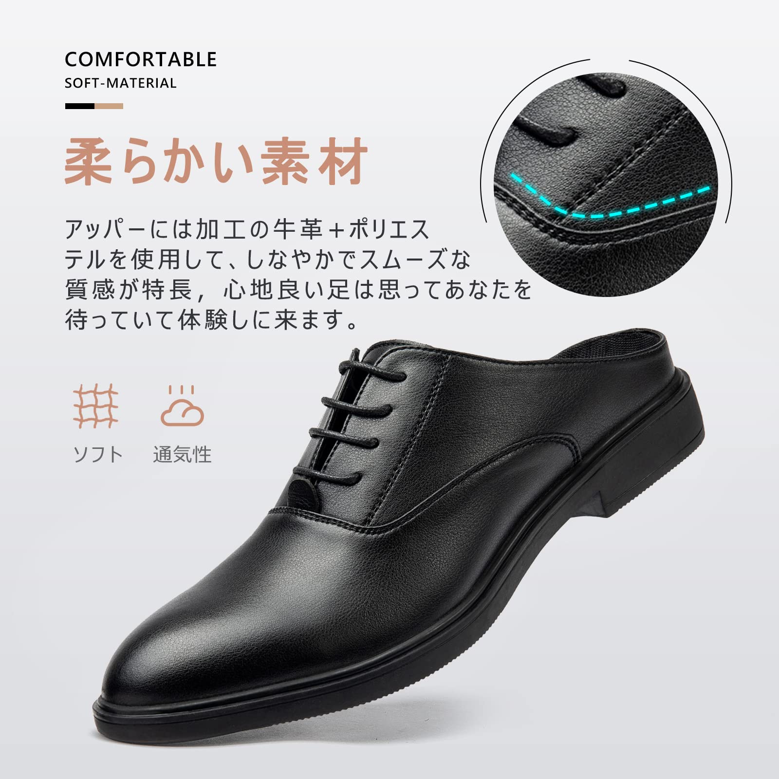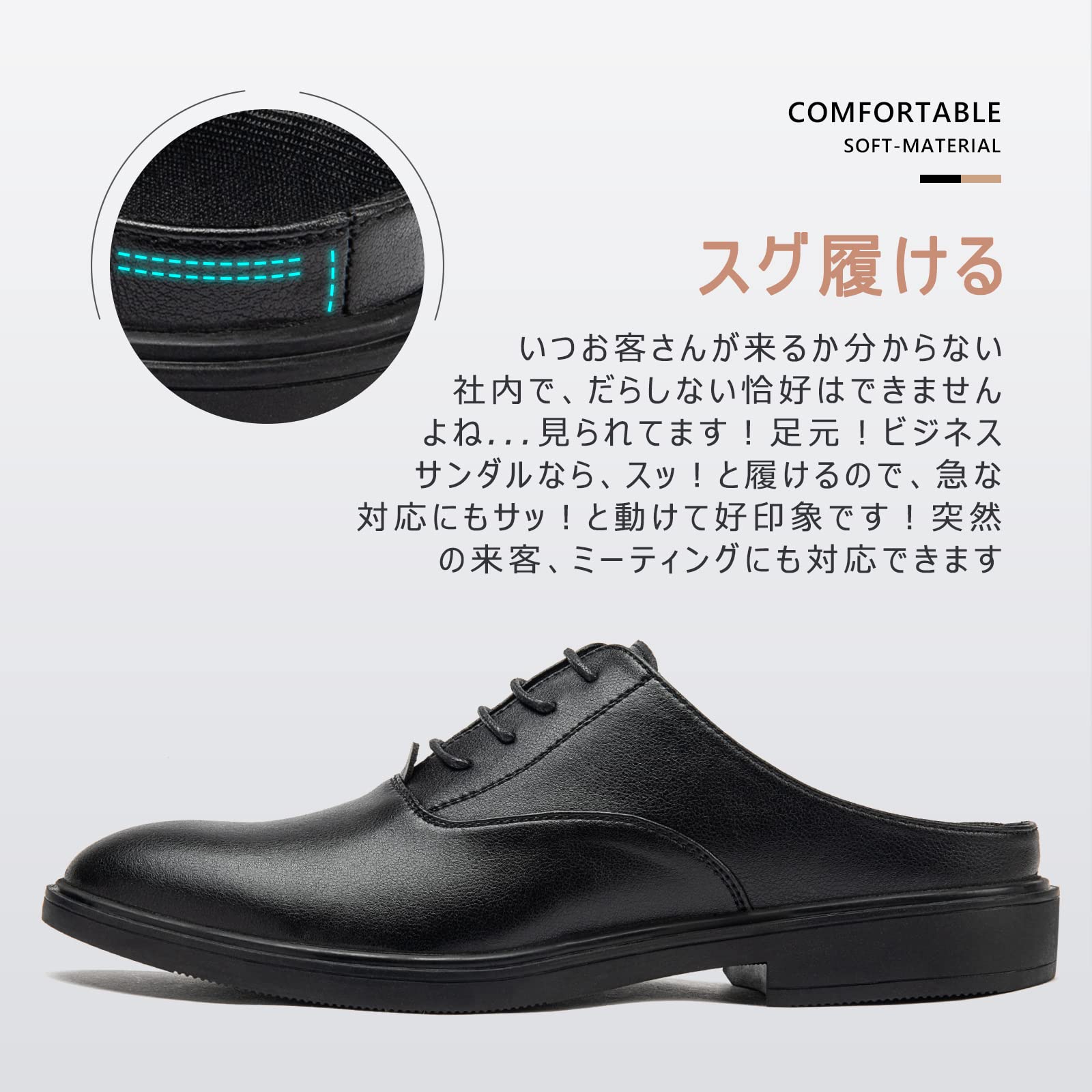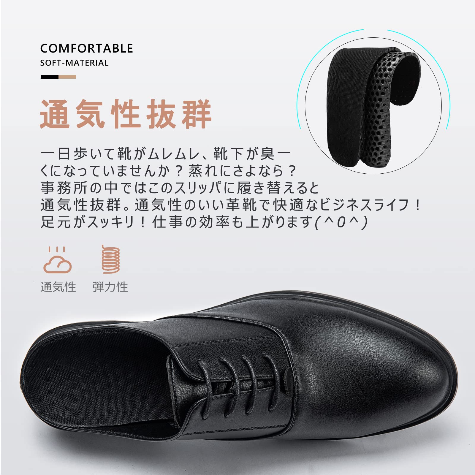 【通気性抜群、オフィスシューズ代替】蒸れにさよなら?!通気性のいいオフィスサンダルで快適なビジネスライフ!ビジネスシューズで汗をかいた分だけ、蒸れていくその足に切り札です。足のむれも解消出来て、臭いが気になることもなくなりました!快適に仕事が出来て、足むれがなくなるなんて一石二鳥ですね!蒸れにくい構造で「社内サンダル」として1日中清潔に.