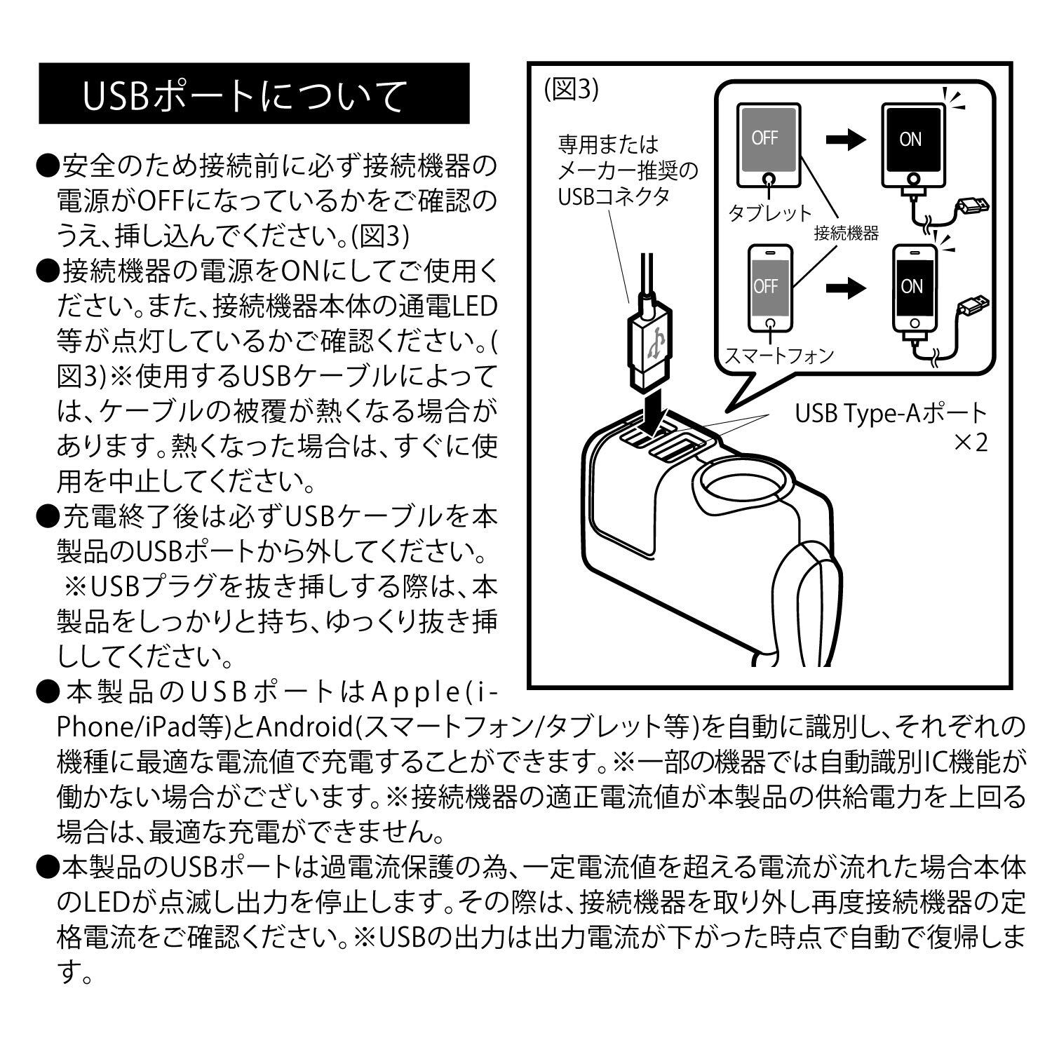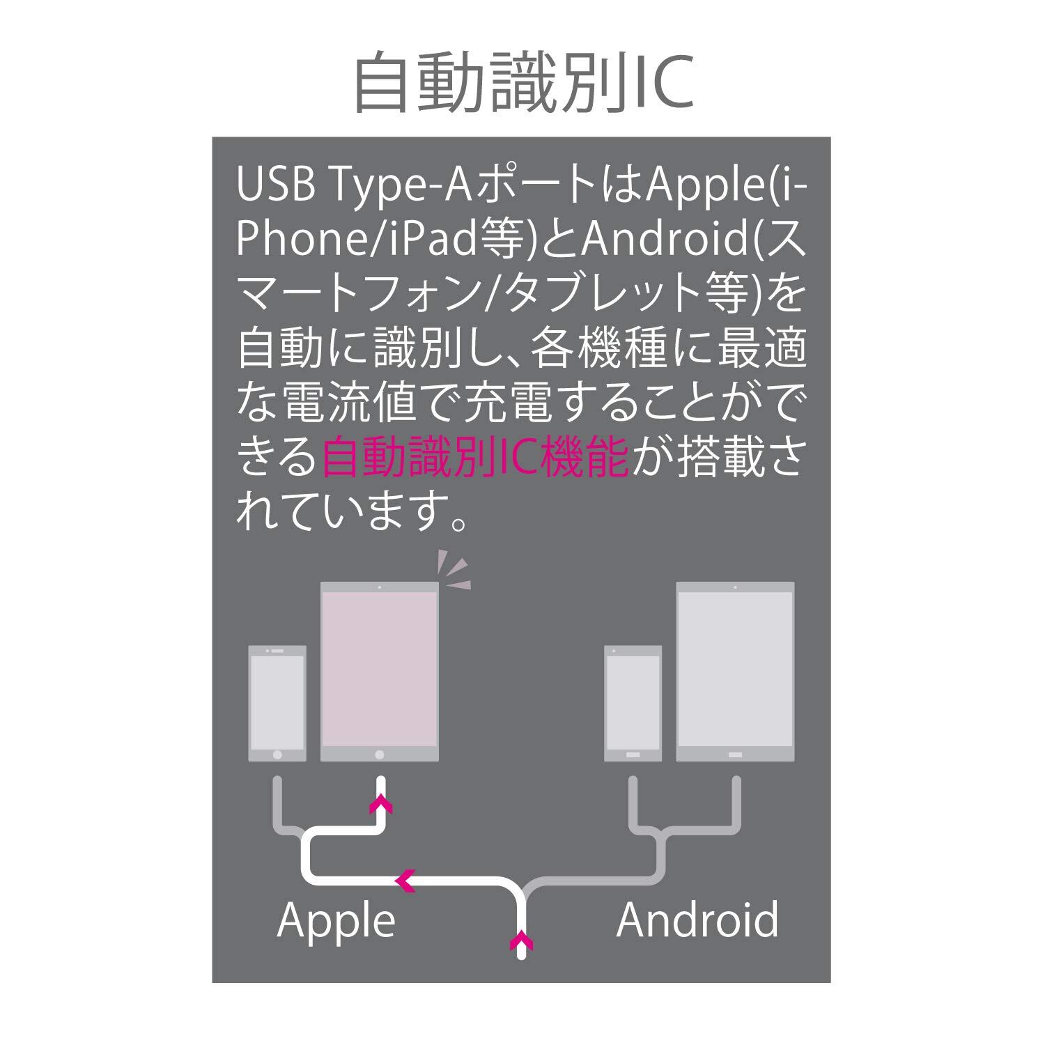 【USB出力はスマートIC機能搭載】スマホやタブレット等、接続機器を自動に識別し、それぞれの機種に最適な電流値で充電することができます。