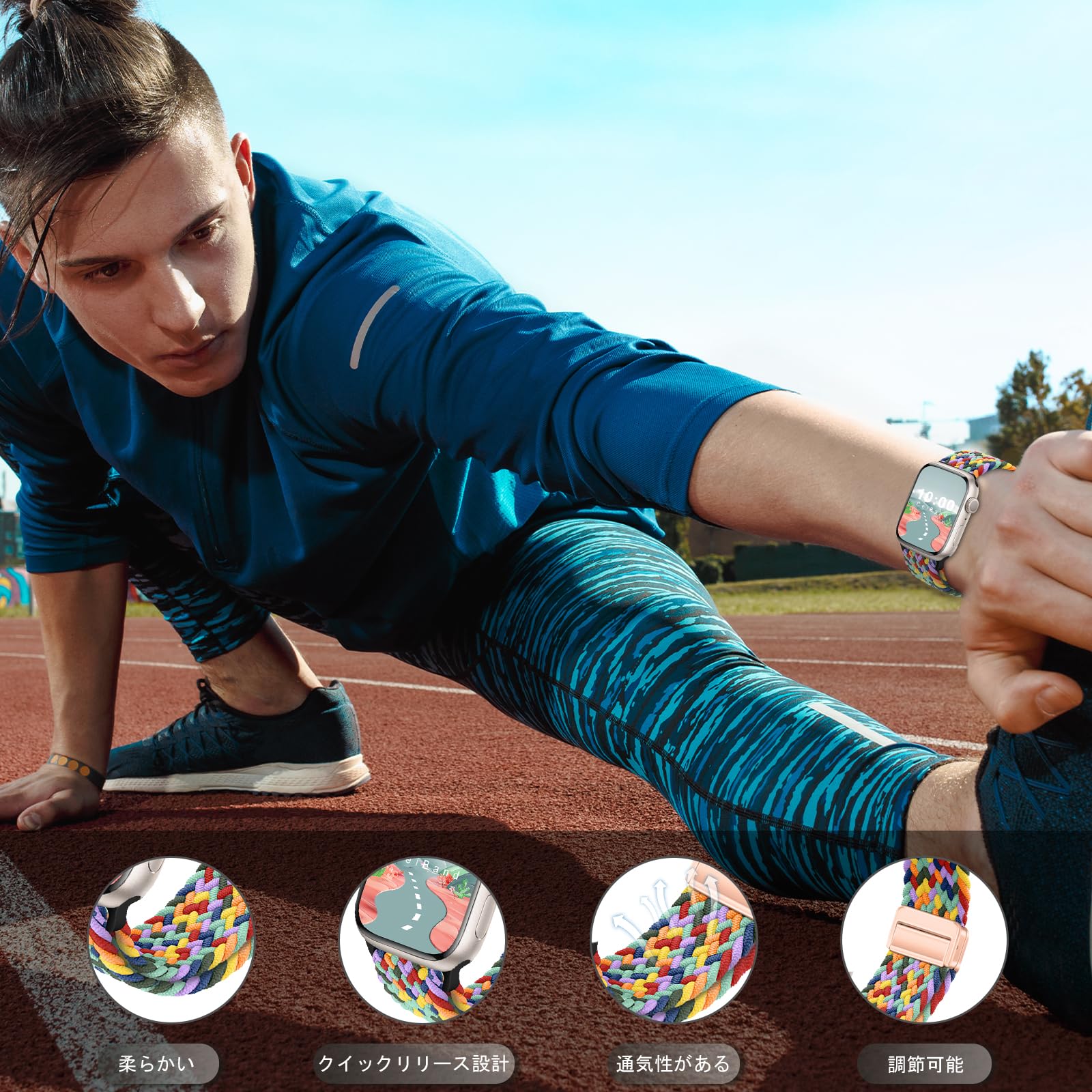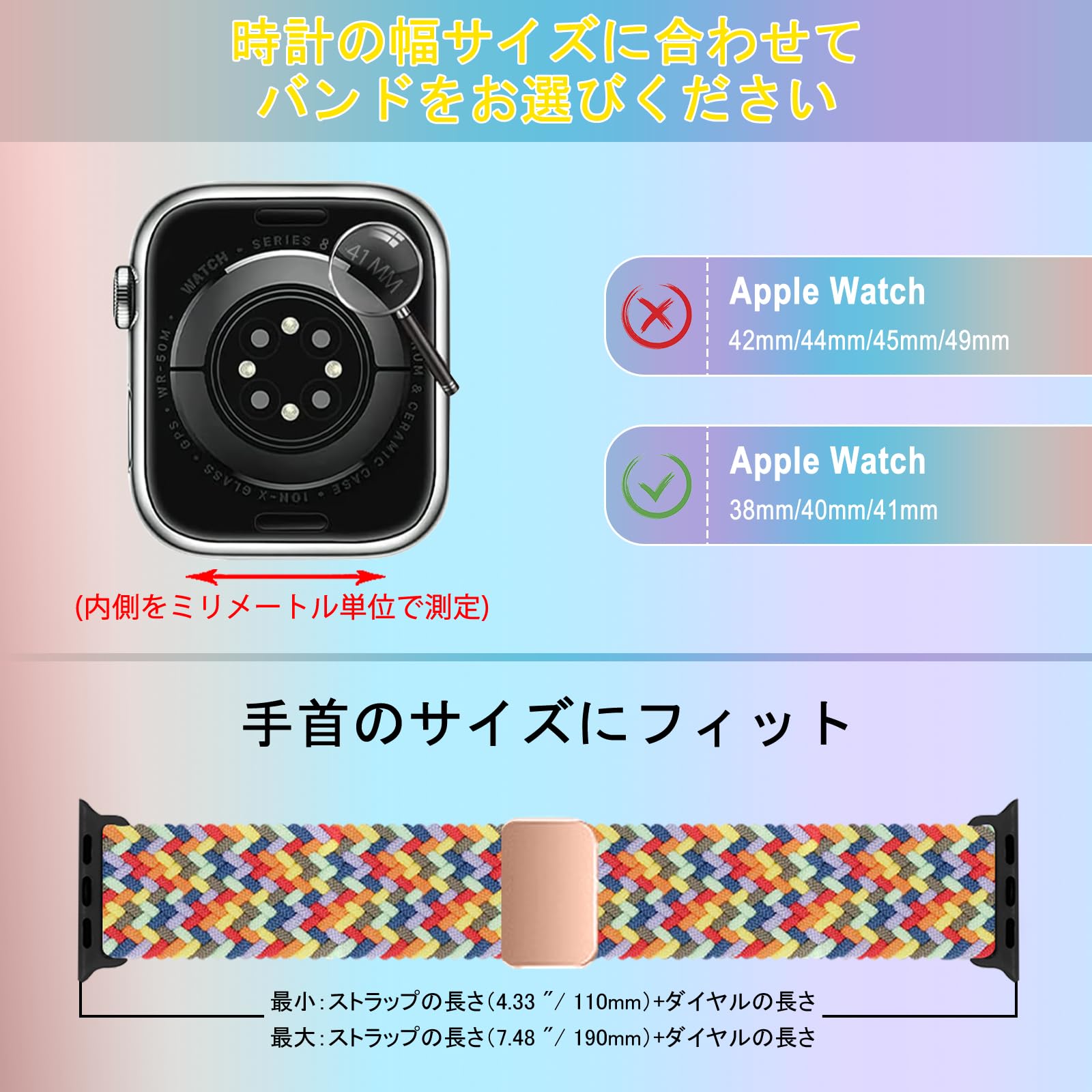 【数量限り】バンド Apple Watch 41/40/38mm 用 交換ベルト 編み 腕時計バンド Apple Watch Series 9 41mm 対応 弾力性 ベルト ナイロン 編み込み 磁気吸着式バックル スポーツバンド メンズ レディース 時計バンド スマートウォッチバンド iWatch SE/SE 2/Series 10/9/8/7/6/5/4/3/2/1 -(Wレインボー)