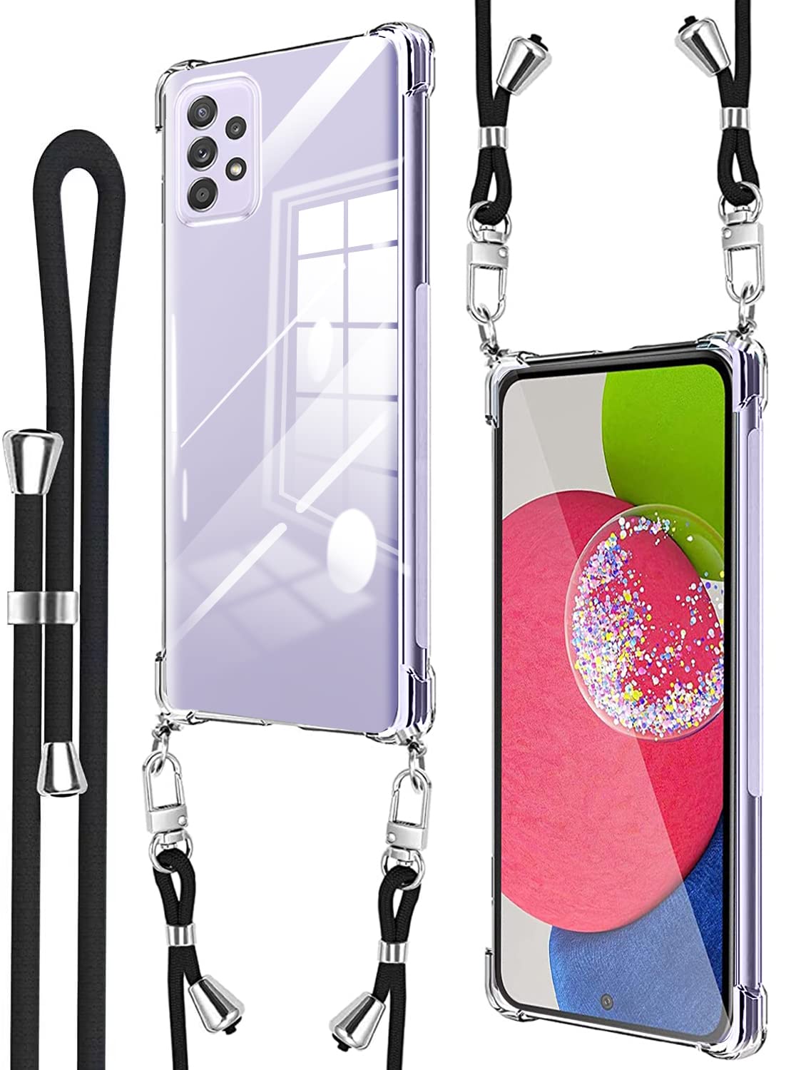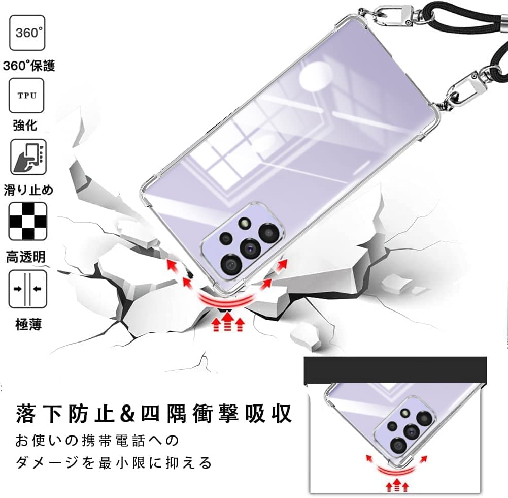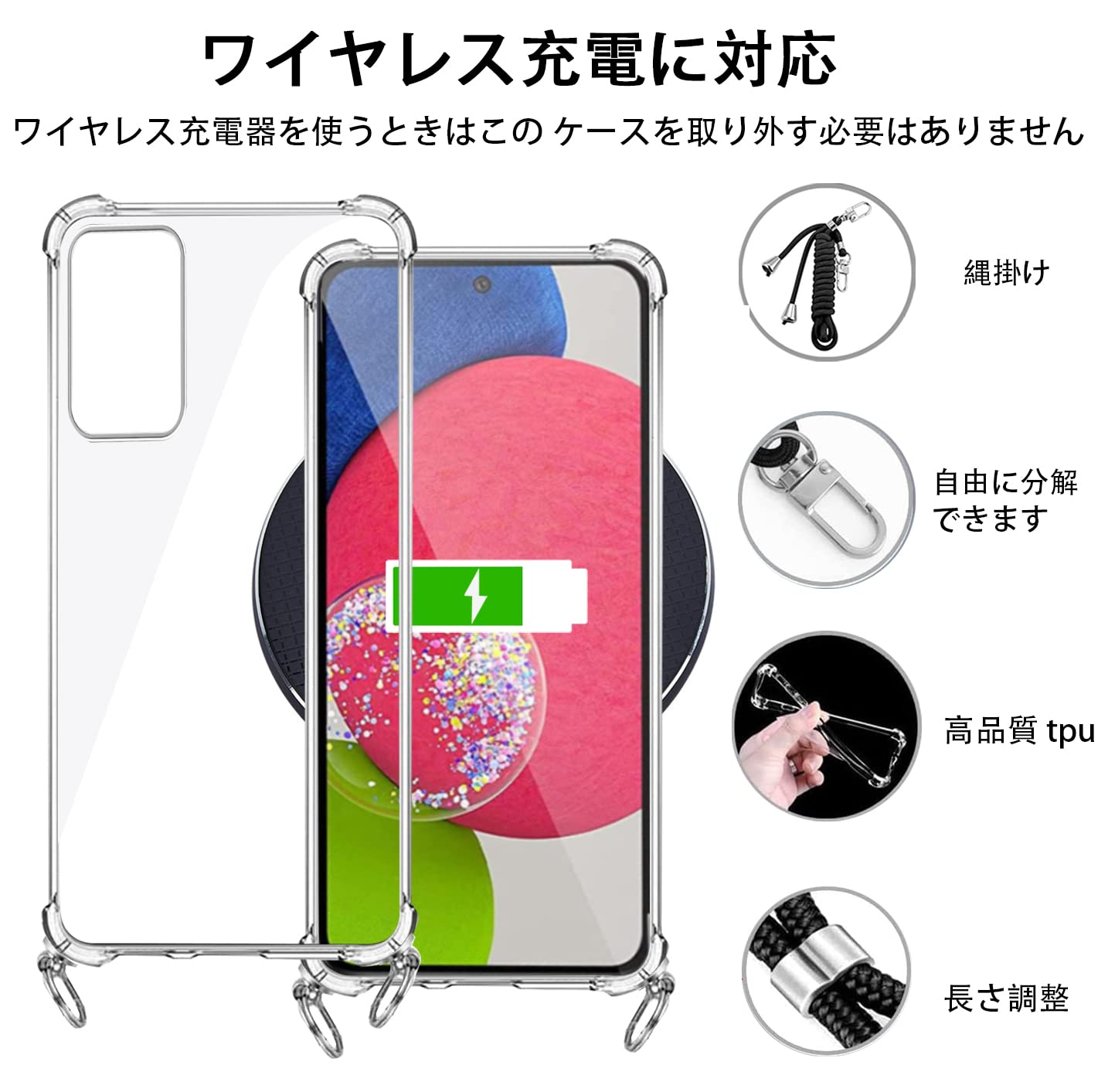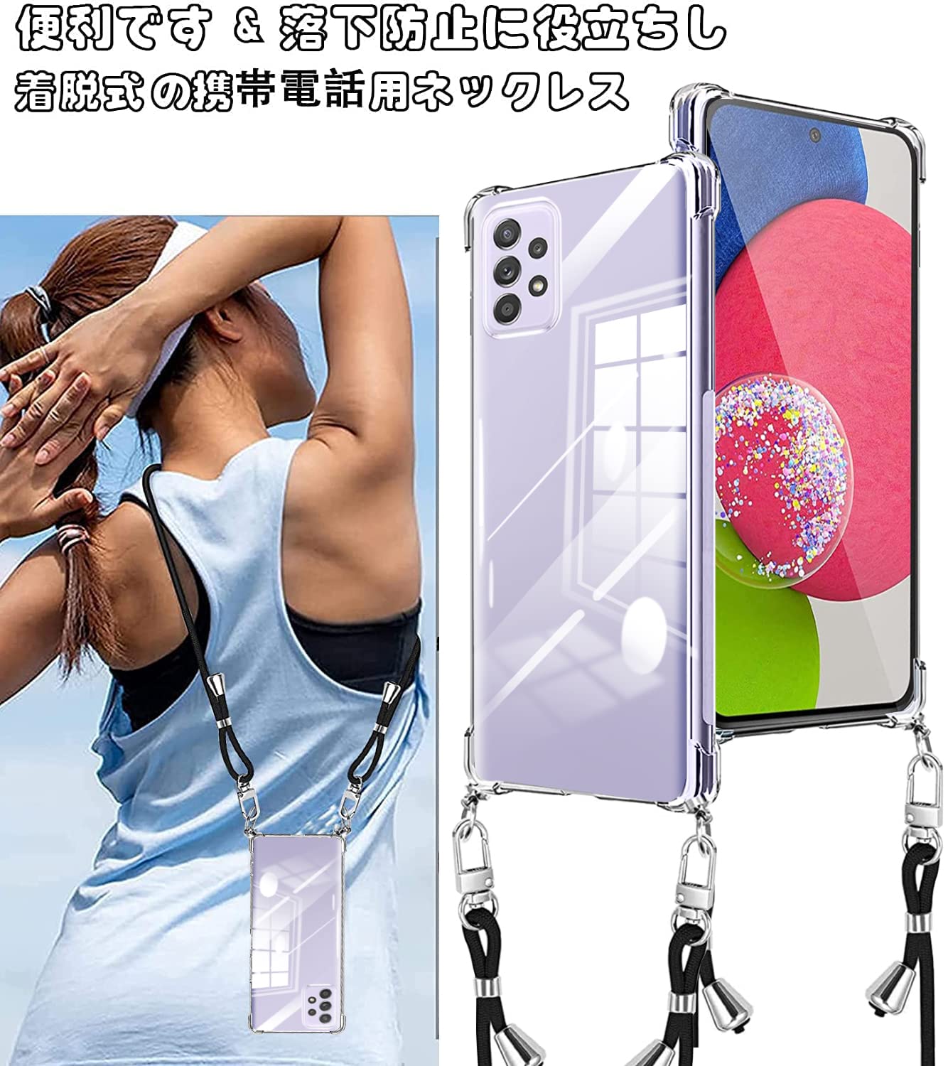 Galaxy A52 5G ケース 耐衝撃 クリア SC-53B SOG05 スマホケース ギャラクシa52 5g 保護カバー 調節可能な ショルダー 肩がけ首掛け 紐付き 薄型 縄掛け ケース 斜めかけケース 透明 より良い滑り止め、TPU 吸収 ワイヤレス充電対応 携帯ケース【縄掛け-ブラック 】