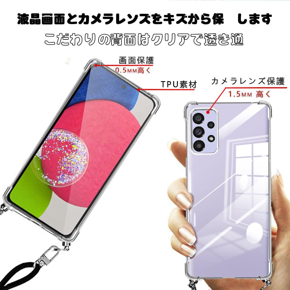 Galaxy A52 5G /SC-53B SOG05 ケース にはリストストラップとネックストラップが付属します、調節可能なストラップにより、サイド、またはフロントに持ち運べるときに完璧にあなたの隣に掛けることができます。 高透明率の高い特殊なTPU素材を持ち、黄ばみも付きにくい。薄くて丈夫で柔軟性が高く、程よいグリップ感があり、本体の持つスリムさをできる限り損なわないよう設計しています。着脱も簡単で、スマホ本体への擦り傷も心配無用です。衝突や引っかき傷から電話を保護できます。ストラップは、一般的なストラップの1.5倍の厚さで、ストラップを壊さない高品質の強化および厚みのあるナイロン素材で作られています。金具は高品質のステンレス鋼でできており、耐久性が高く錆びません。このアクセサリーはファッションだけでなく、通常のストラップよりも快適で実用的です。 作業、旅行、出張、ショピング、散歩、コンサート、パーティーに最適です。手を離しても、携帯電話を携帯できます。