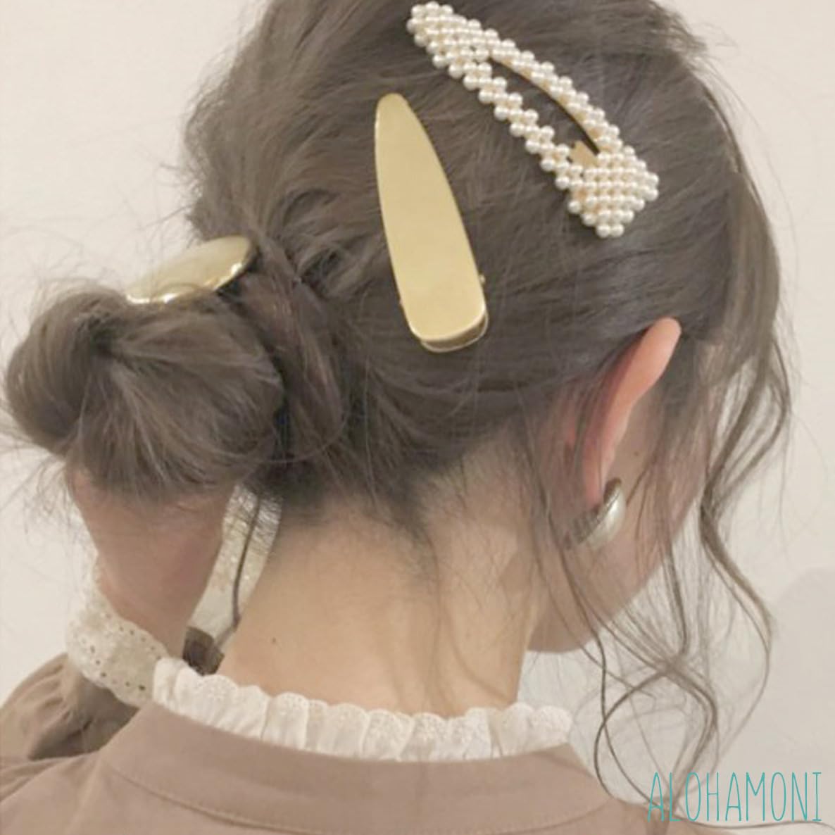 【努力特価】[ALOHAMONI] パール ヘアクリップ リッチパール ヘアピン バレッタ バナナクリップ ビッグ 大ぶり スリーピン パッチン留め 前髪 ヘアアクセサリー 髪留め 髪飾り 韓国 オルチャン (三角)