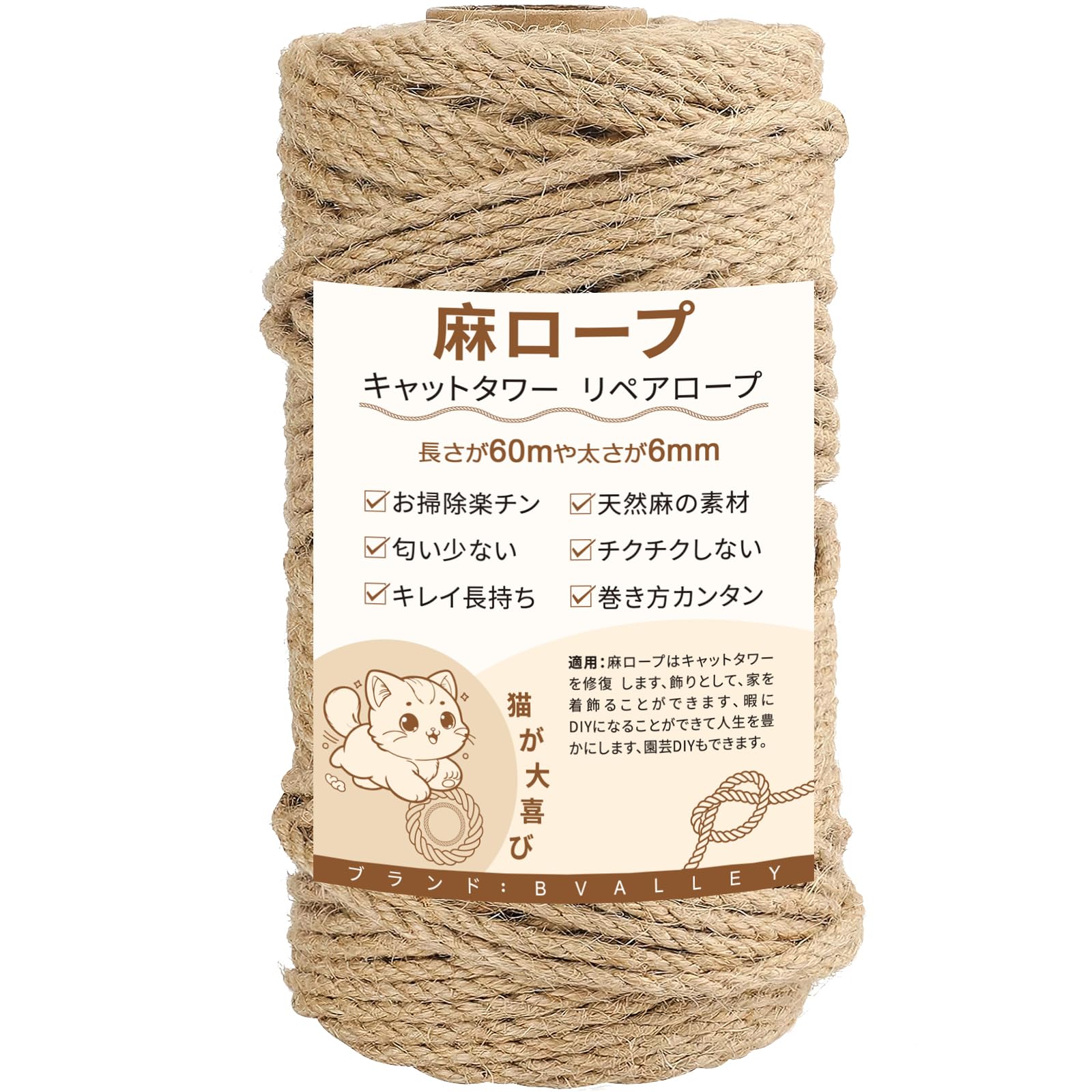 BValley 6mm x 60M 麻ロープ 麻縄 麻紐 天然繊維 麻ひも リペアロープ 猫タワー スクラッチャー 爪研ぎ 園芸 手芸 DIY アウトドア 梱包,麻縄はボロボロになったキャットタワーの爪とぎ場所が補修できます。園芸DIY、花瓶、壁飾り、手芸や飾りに適しています。家のテーブルやソファーの足、水道管、角柱、階段手すりなどの家具に巻きられて、引っかかれるを防ぐ効果があり、家具などを保護できます。