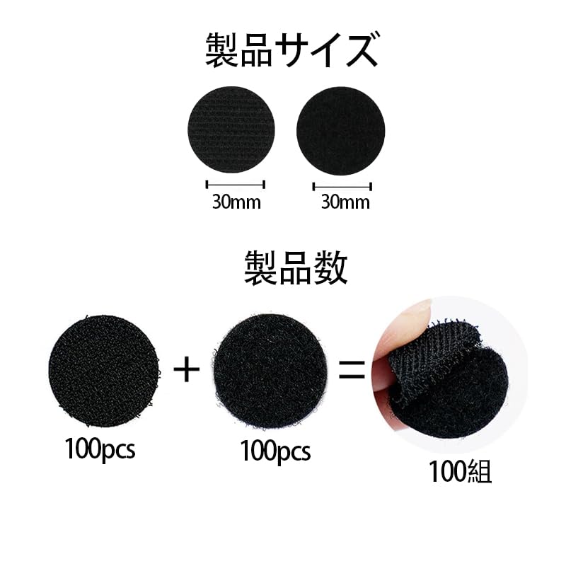 【在庫処分】面ファスナー 丸型 強力 マジック付きテープ 両面テープ付き 粘着テープ 円形の直径 100組セット 粘着力強い両面テープ オス メス 強粘着裏糊付 超強力 粘着 耐熱 防水 業務用 DIY用 家庭用 (ブラック30mm(100pcs))