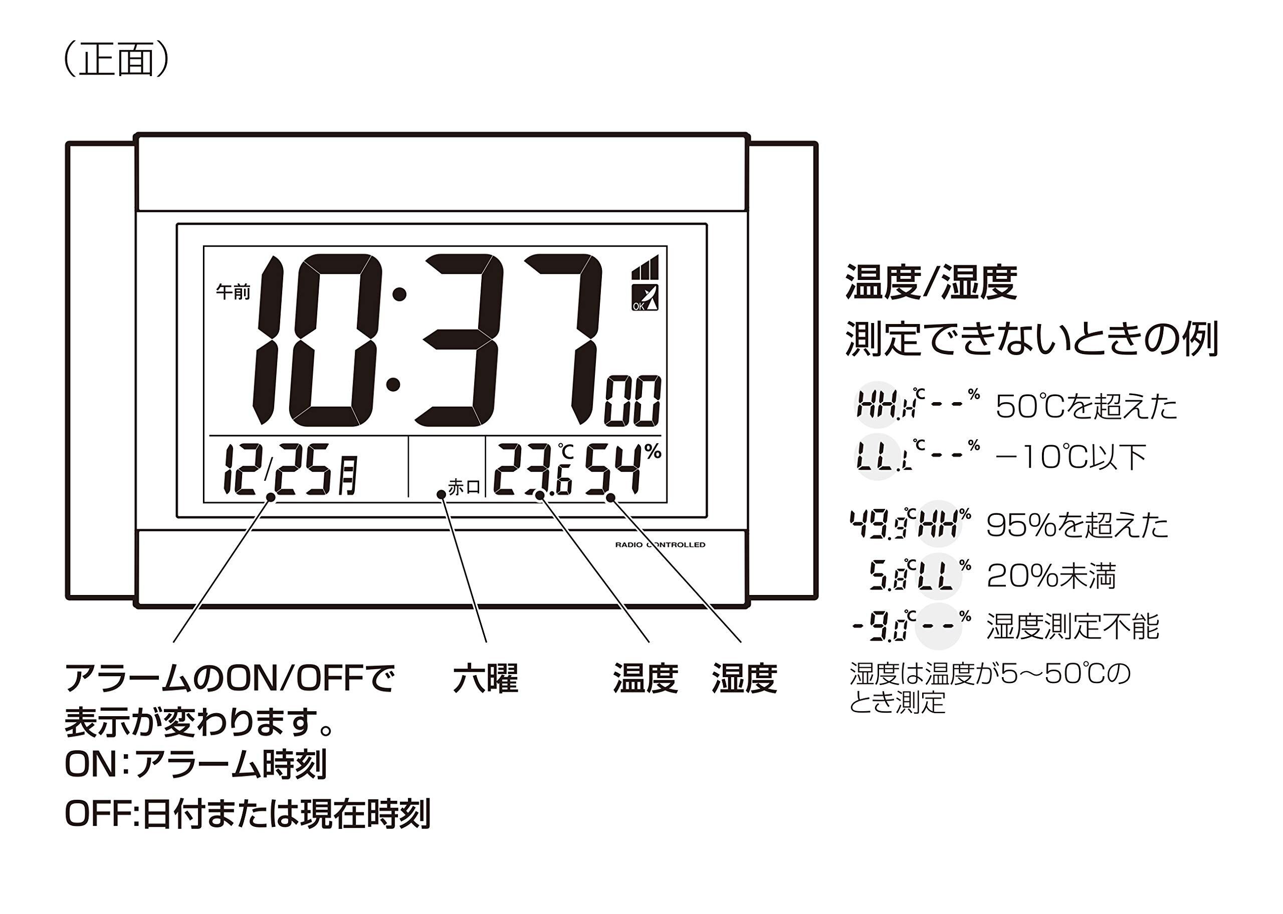 機能:12or24時間表示切替式/カレンダー表示(2099年12月31日までプログラム)/時刻orカレンダー表示切替/温度表示(-9.9~50℃)/湿度表示(20~95%)/六曜表示(2030年12月31日までプログラム)