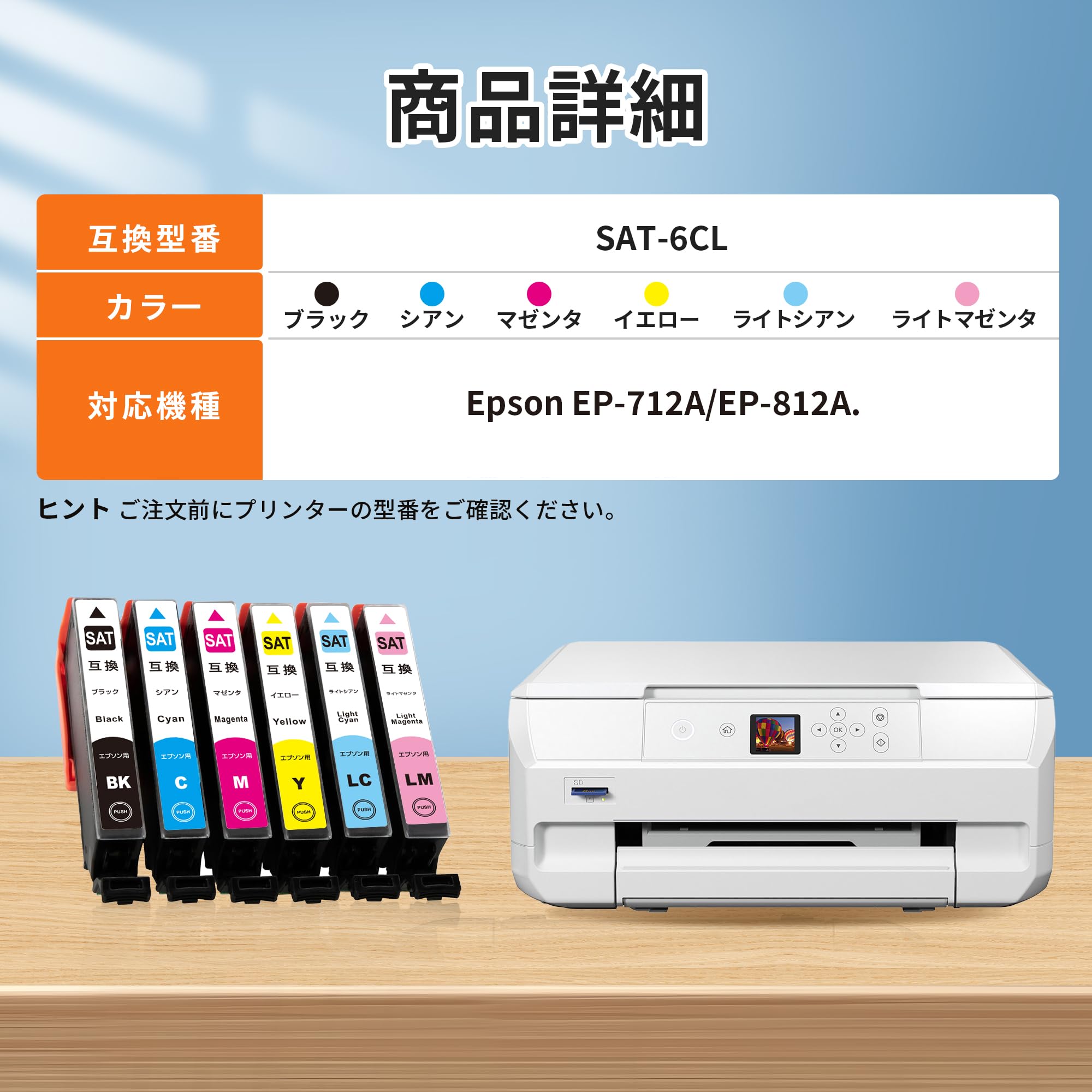 【セット内容】互換SAT-6CL インク合計6本セット: SAT-BK (ブラック)×1本、SAT-C (シアン)×1本、SAT-M (マゼンタ)× 1本、SAT-Y (イエロー) ×1本、SAT-LC (ライトシアン) ×1本、SAT-LM (ライトマゼンタ) ×1本。
