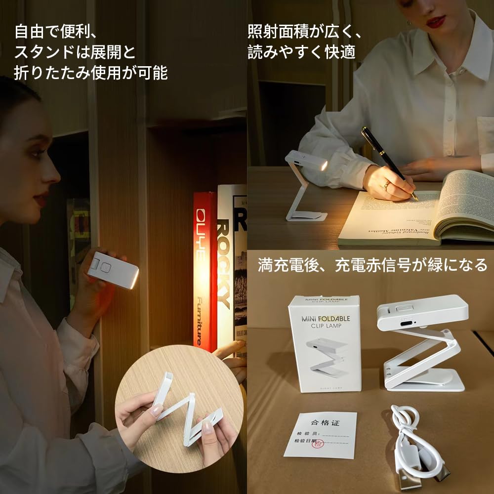 LEDミニ充電ポータブル読書灯、折りたたみ式デスクトップ作業と学習灯、クリップ式書籍ベッドヘッドウォームランプ、3色温度無段階調光小書部品。