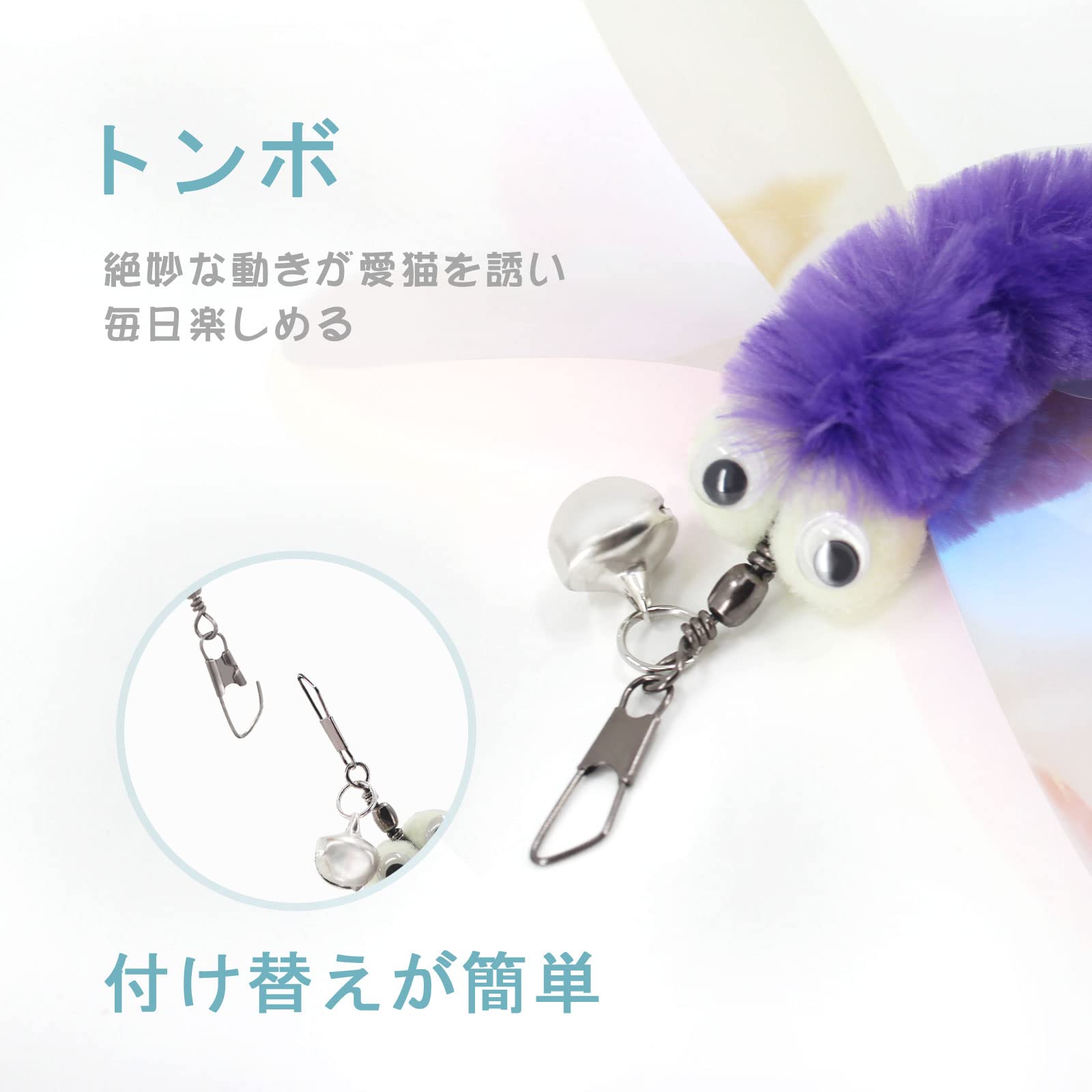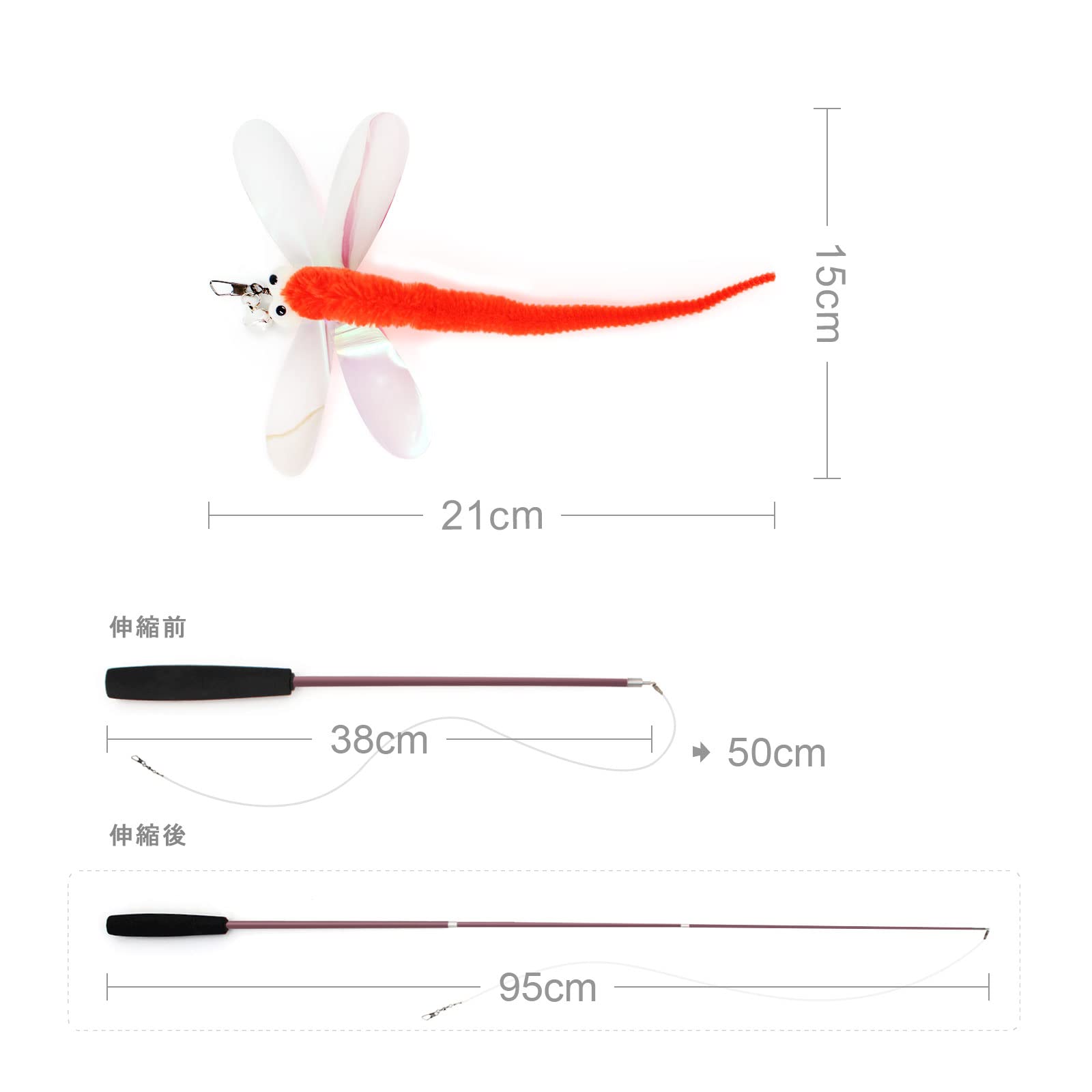 猫のおもちゃ:トンボのような飛び方と羽の音が猫達を興奮させてよく遊んでくれます。トンボの虫のように作り、羽のキラキラさを感じと、しっかり猫たちは食いつきます。猫に無害な材質を使用しており、健康を維持するのに、最適な猫おもちゃです。