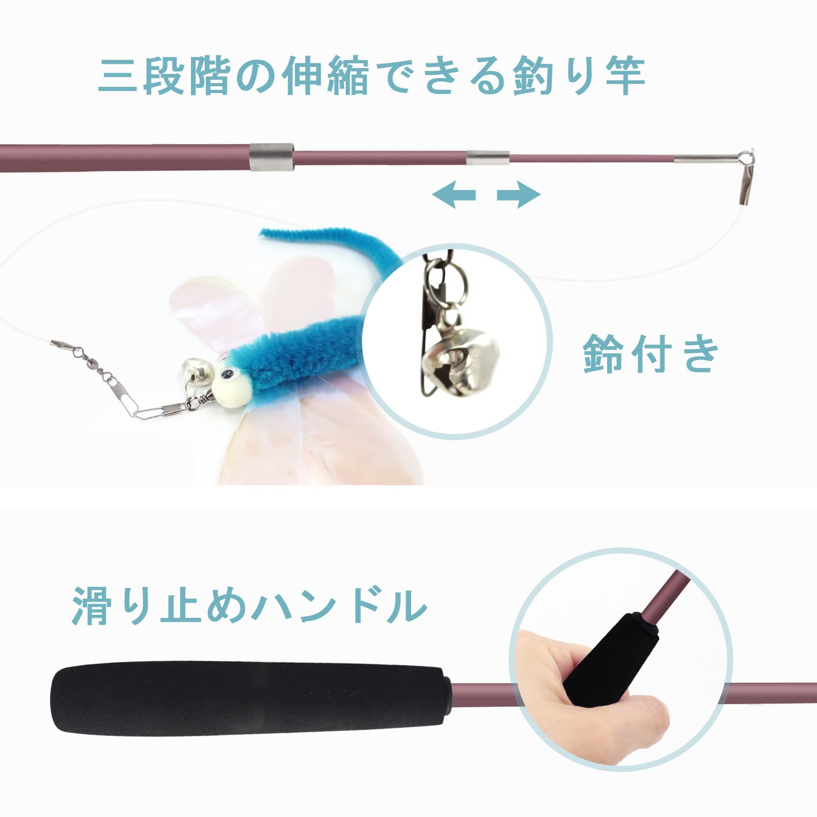 伸縮可能な釣り竿:このじゃらしは竿を伸縮させることができます。そのため部屋のサイズや飼っている猫に合わせて竿の長さを調整することが可能です。先端に付けるおもちゃも6種色入っているため気分によって付け替えて楽しむこともできます。