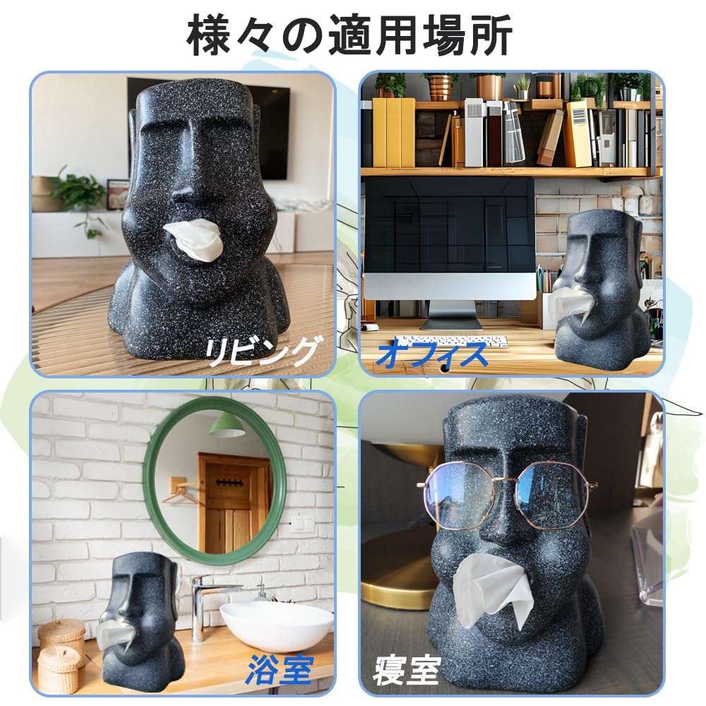 【簡単収納でき】袋やボックスのまま背面から簡単に出し入れできます。モアイの可愛い鼻からティッシュを引き出すの面白みなるデザイン。更に、底面には滑り止めが付いて、ティッシュケースがテーブルから落ちるのは難しいです。