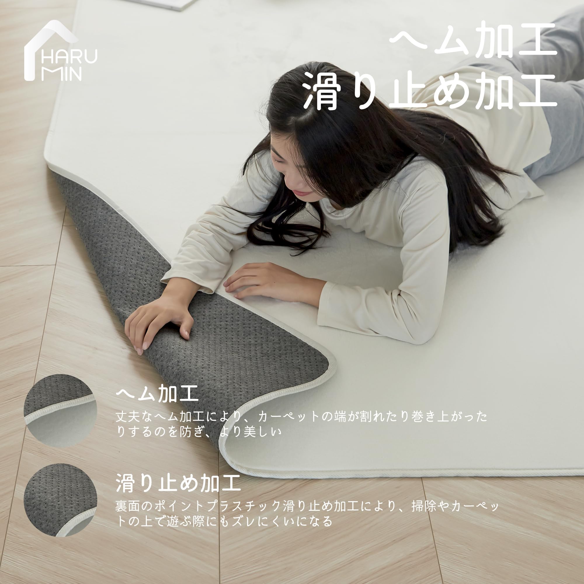 ??【滑り止めでズレにくく、まるで床に貼りついているかのようなカーペット】丈夫なエッジ加工と底部の点プラスチック加工により、上で走ったり飛び跳ねたり、また掃除機をかけても移動しにくくなっており、子供やペット、お年寄りのいるご家庭におすすめです。