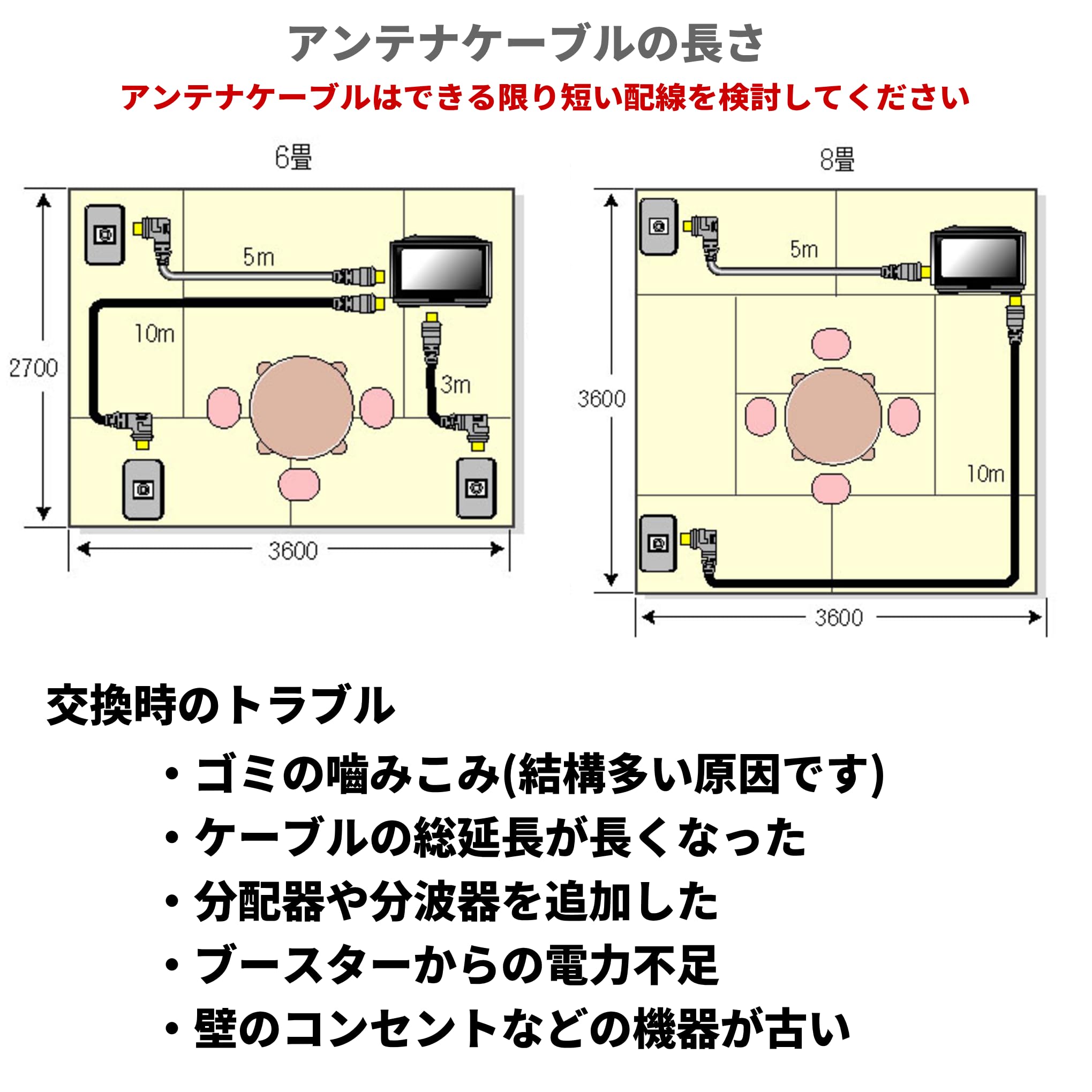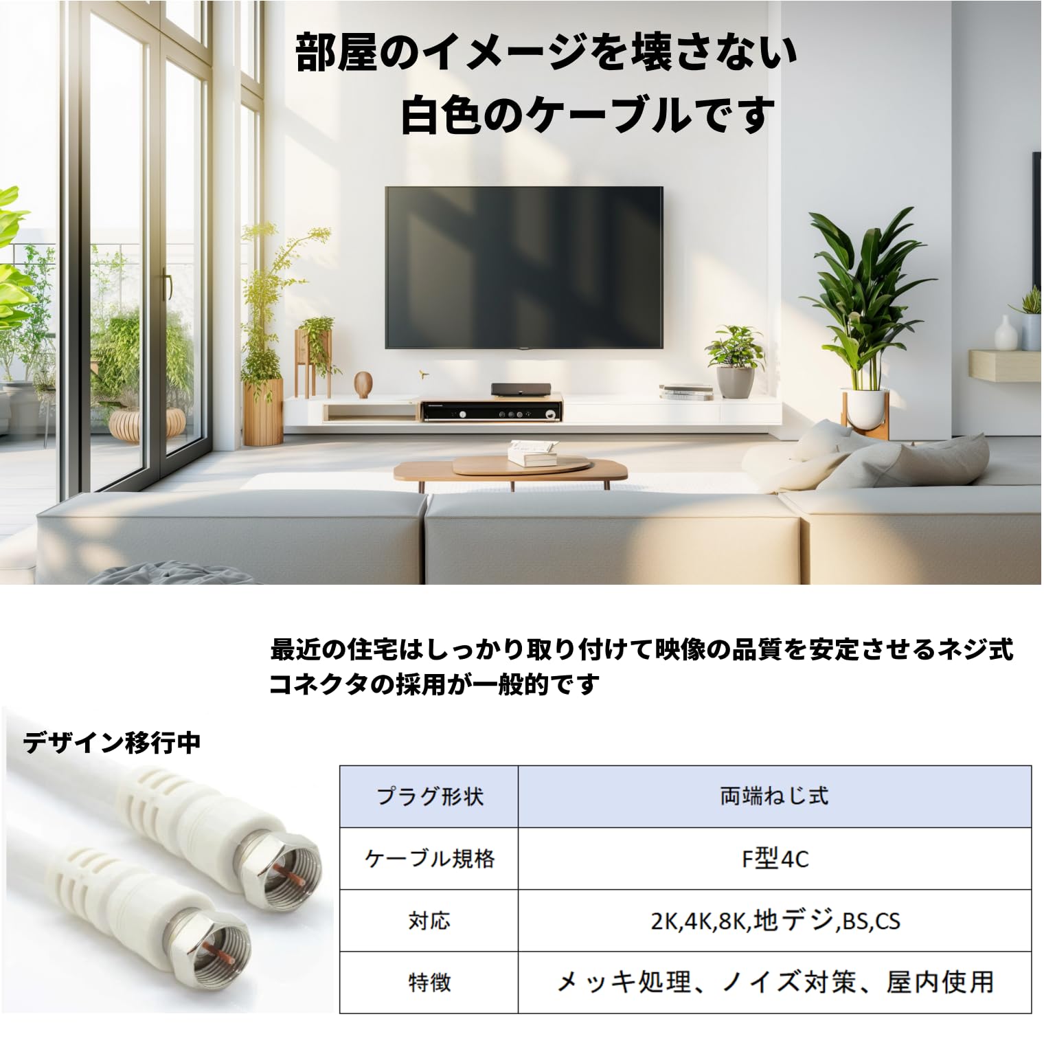 ? F型ネジ式コネクタ採用:しっかり固定でき、接触不良や抜け落ちを防止 ? 2K・4K・8K放送対応(最大3224MHz):地デジ・BS・CSすべてに対応 ? 高シールド構造:外部ノイズを遮断し、安定した映像・音声を実現 ? 金メッキ端子:信号劣化を防ぎ、長期使用でも高品質を維持 ? 柔軟なケーブル素材:取り回ししやすく、狭いスペースでも設置可能 ? 選べる長さ:50cm / 1m / 2m / 3m / 5m など用途に応じて選択可能