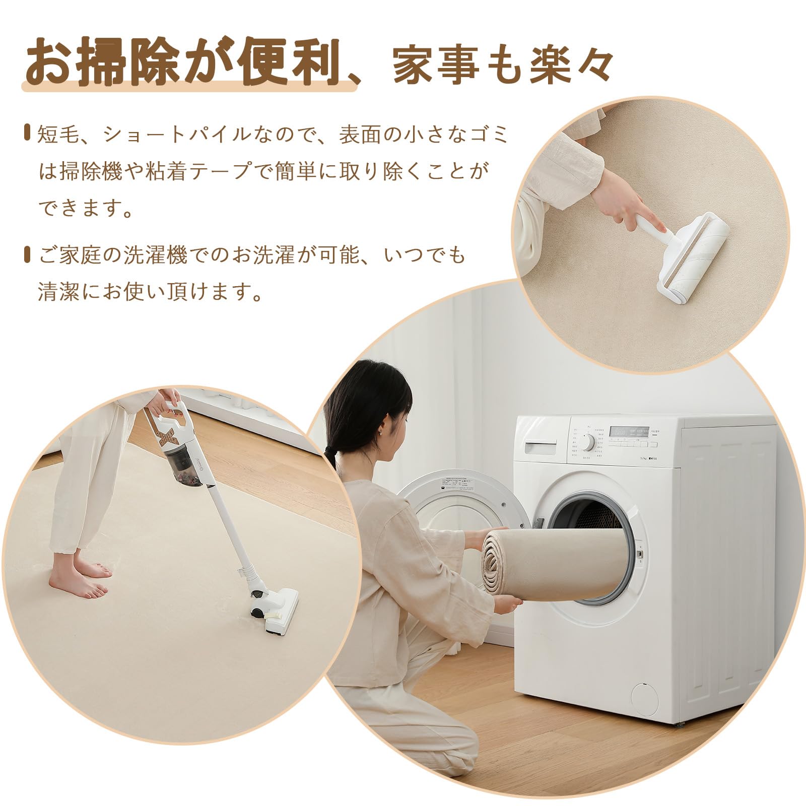 【お手入れ簡単】 このカーペットは毛足が3mmという短毛・ショートパイル??は、お手入れの手間を大幅に?らします。抜け毛が少なく、掃除機や粘着テープでお掃除もでき、いつも整?な状態を保てます。また、洗濯機で丸洗いできるので、深度のお手入れが簡単にできます。