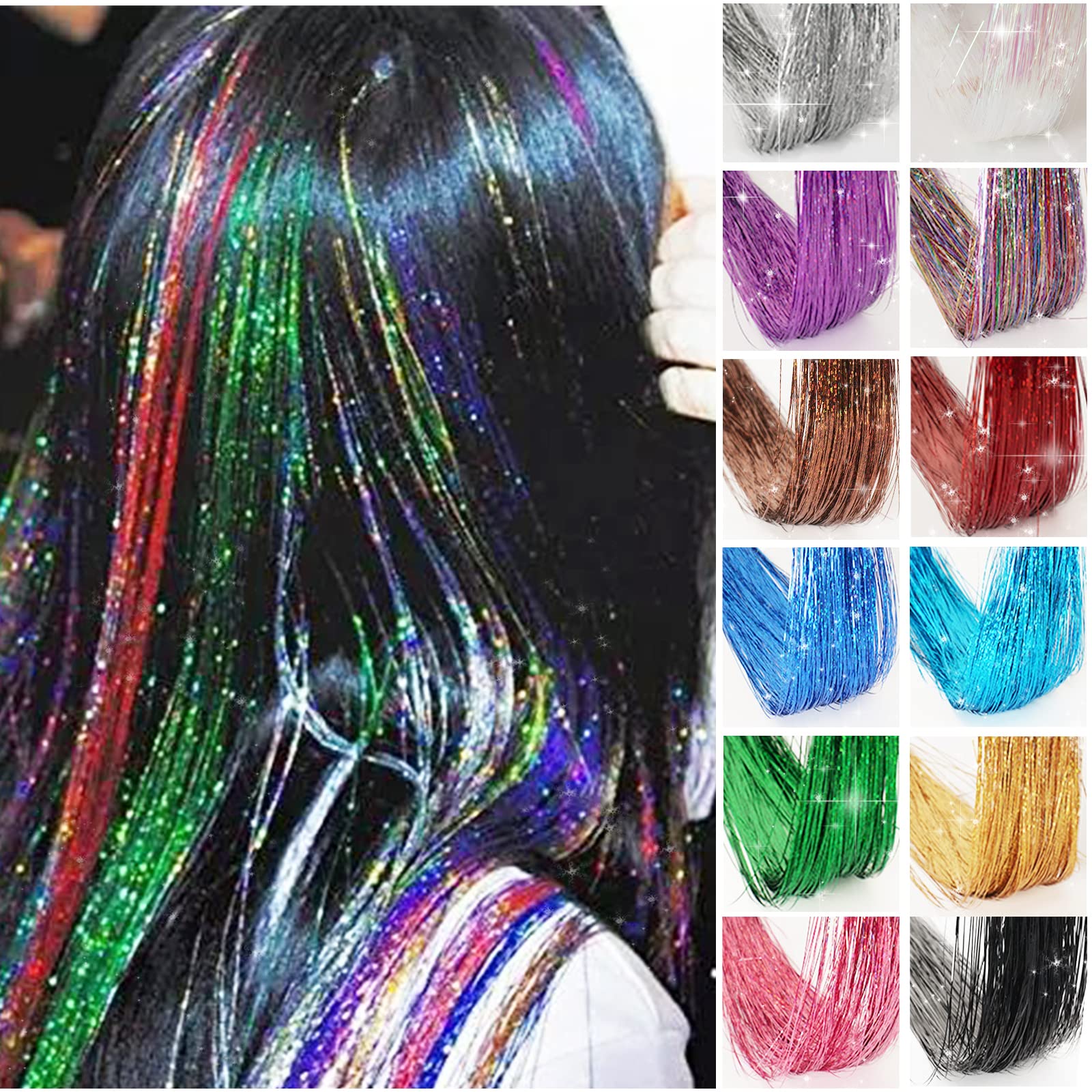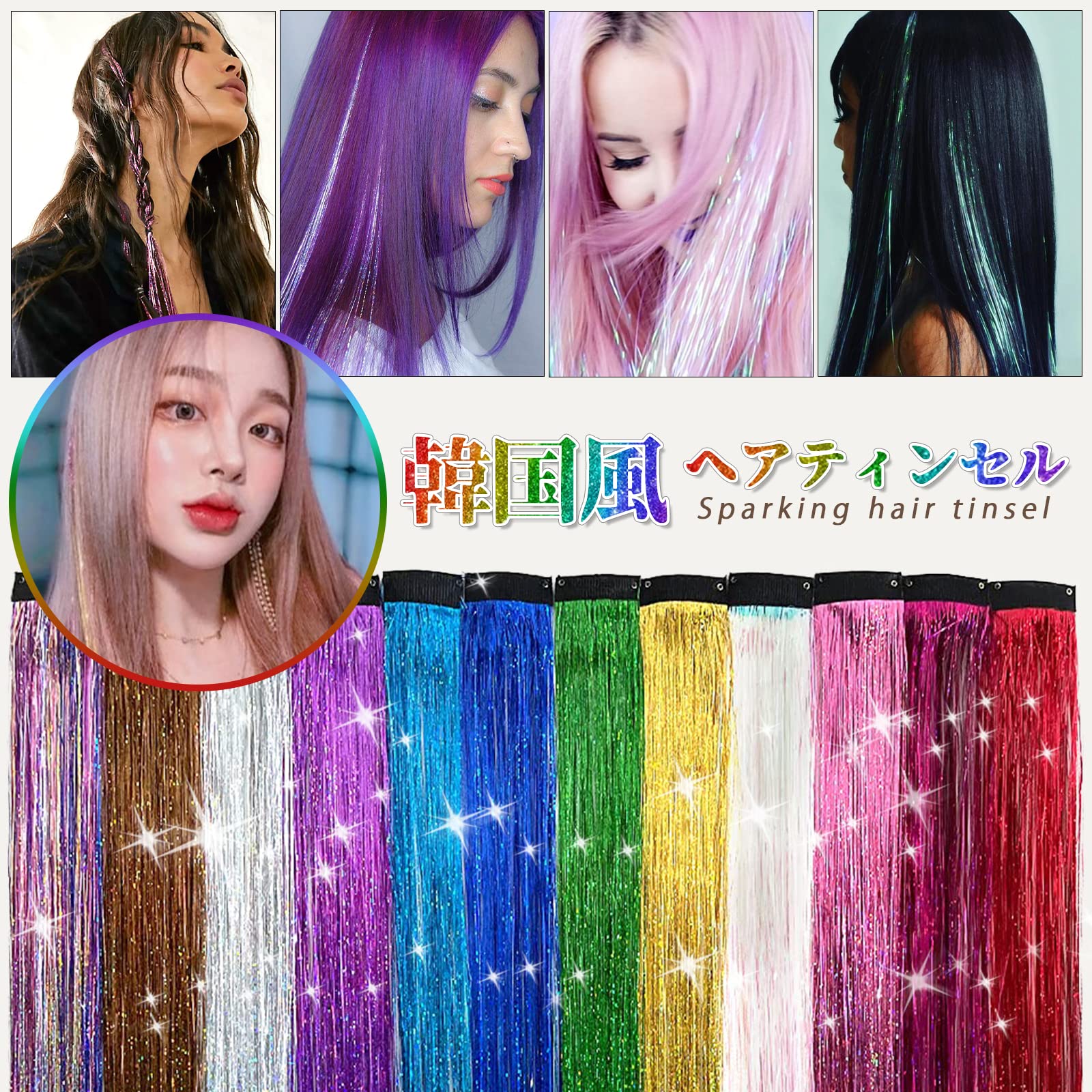 効果:髪に適量のティンセルエクステを入れて、髪型に合わせて、風に髪が揺れたり、光に当たったりするときに、キラキラ光ります。普段使いにのみならず、舞台や祭り、ハロウィン、コスプレにも適用です。