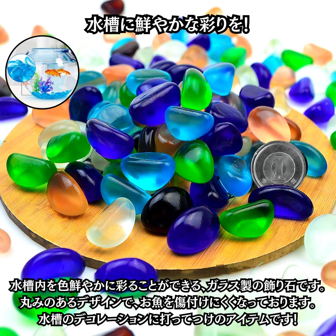 【水槽に鮮やかな彩りを!】水槽内の装飾にお使い頂ける、色合い鮮やかなガラス製の飾り石です。手触りが良い丸みのあるデザインで、魚が触れても傷付けにくくなっております。水槽のデコレーションに打ってつけのアクアリウムアイテムです!