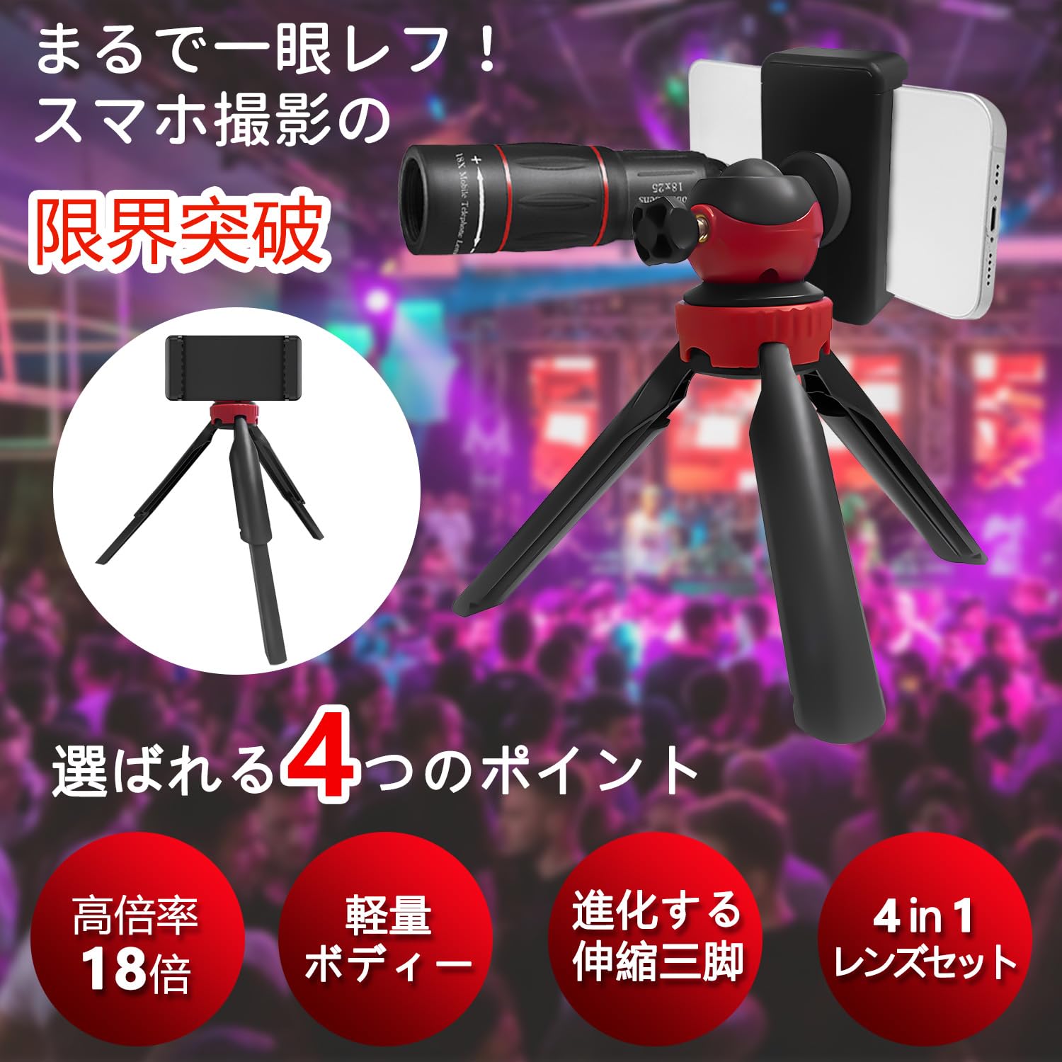 【4in1スマホレンズせット】ライブにおすすめの単眼鏡 スマホ 望遠レンズです!シングルカメラ、デュアルカメラに対応、外付けタイプスマホレンズ4種類付属しており、コンパクトで持ち運びがしやすいスマホ用撮影セット、取り付けが簡単で手軽に本格的な撮影ができる。★スマホ用 単眼鏡 望遠レンズを使えば、遠い景色を撮影しても画質の劣化しません。BaK7材質から高級プリズム材質Bak4に進化しました。それにより色彩の再現性がはるかに向上しました。そして、マルチコーティング光学レンズを採用して、推しの表情をハッキリ見えるようになります。(フォーカスリングをゆっくり調整し、ヒントを合わせます。)