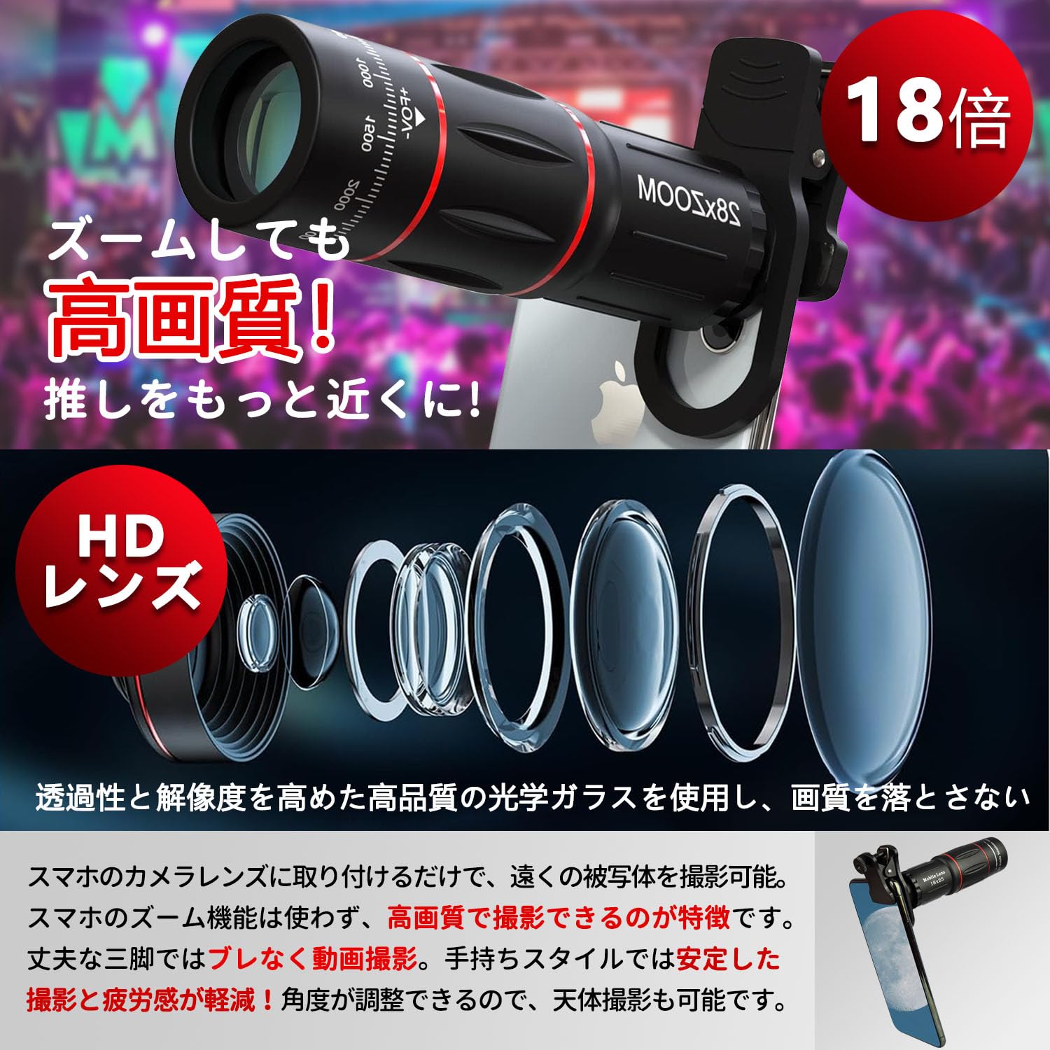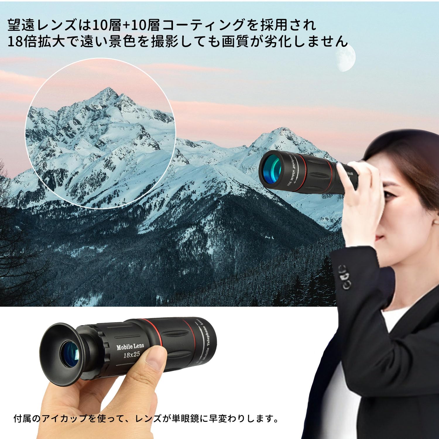 【18倍HD 単眼鏡 高倍率 望遠鏡】18XHDスマホ望遠レンズ、遠い景色をより近づけて、クリアな写真が撮れるスマホ レンズ。望遠レンズ スマホでは、遠い景色を撮影しても画質が劣化することなく手軽に遠距離の被写体を撮影できます。22X 望遠レンズを使用する時は、モバイル画面に触れてフォーカスを調整しないでください。カメラのメインカメラが変更する可能があります。【定点観測も可能】旅行先やお子様の行事等で大活躍!三脚・スマホ固定クリップ等必要な付属品は全て揃っております!アイキャップを付けると単眼望遠鏡として使えます。【軽さは力 脅威の96g】手のひらサイズ 本体12×3.5cm 軽量化と合わせてサイズダウンにもこだわりました。 シェアに非常に便利な品です。