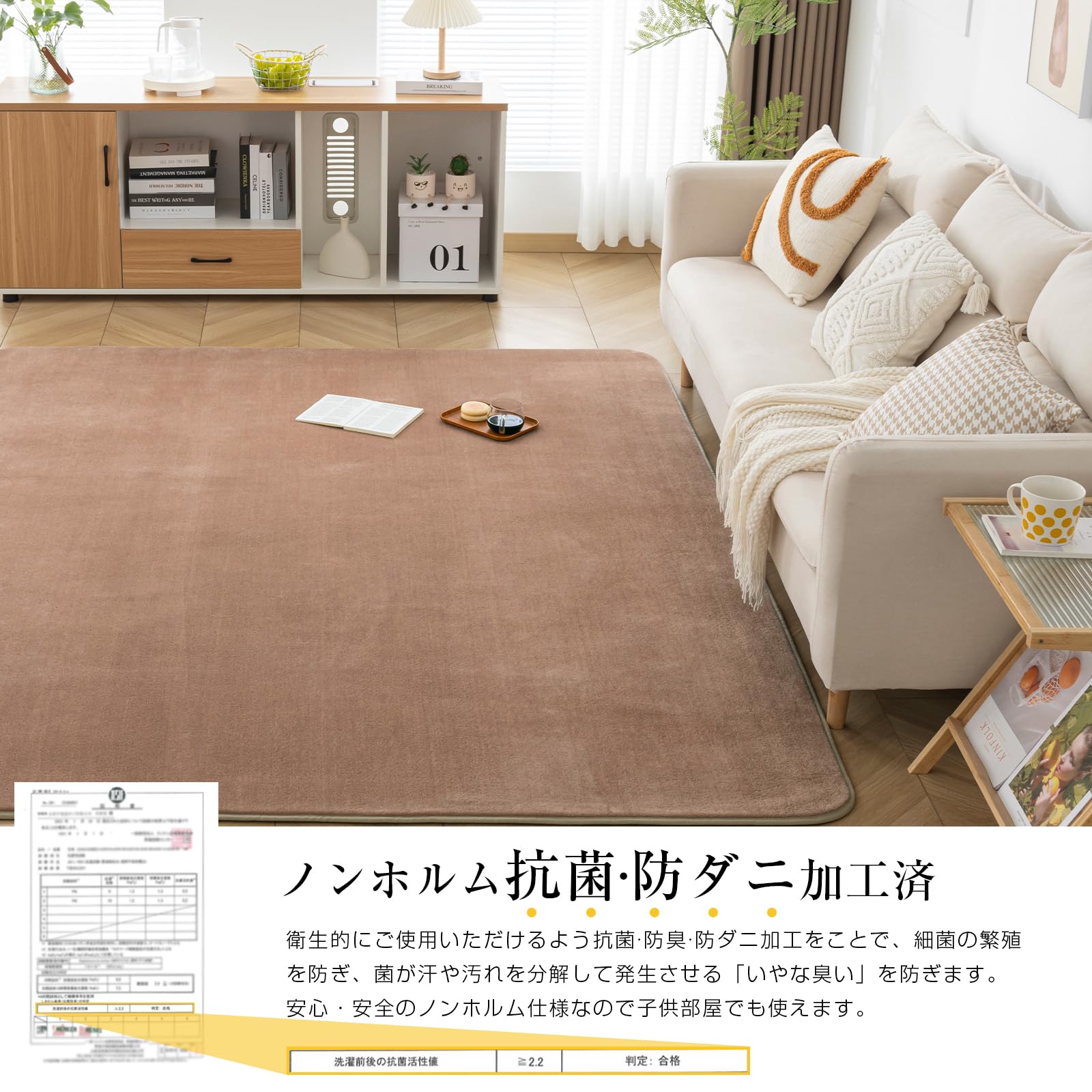 【滑り止め・抗菌・防ダニ加工】衛生的にお使いいただけるよう、抗菌・防臭・防ダニ加工を施しています。ラグの裏面にはゴム製の滑り止め加工を施し、フローリングに敷いても滑りにくく安心です。また、ノンホルム仕様なので、お年寄りやお子様、ペットがいるご家庭でも安全にお使いいただけます。