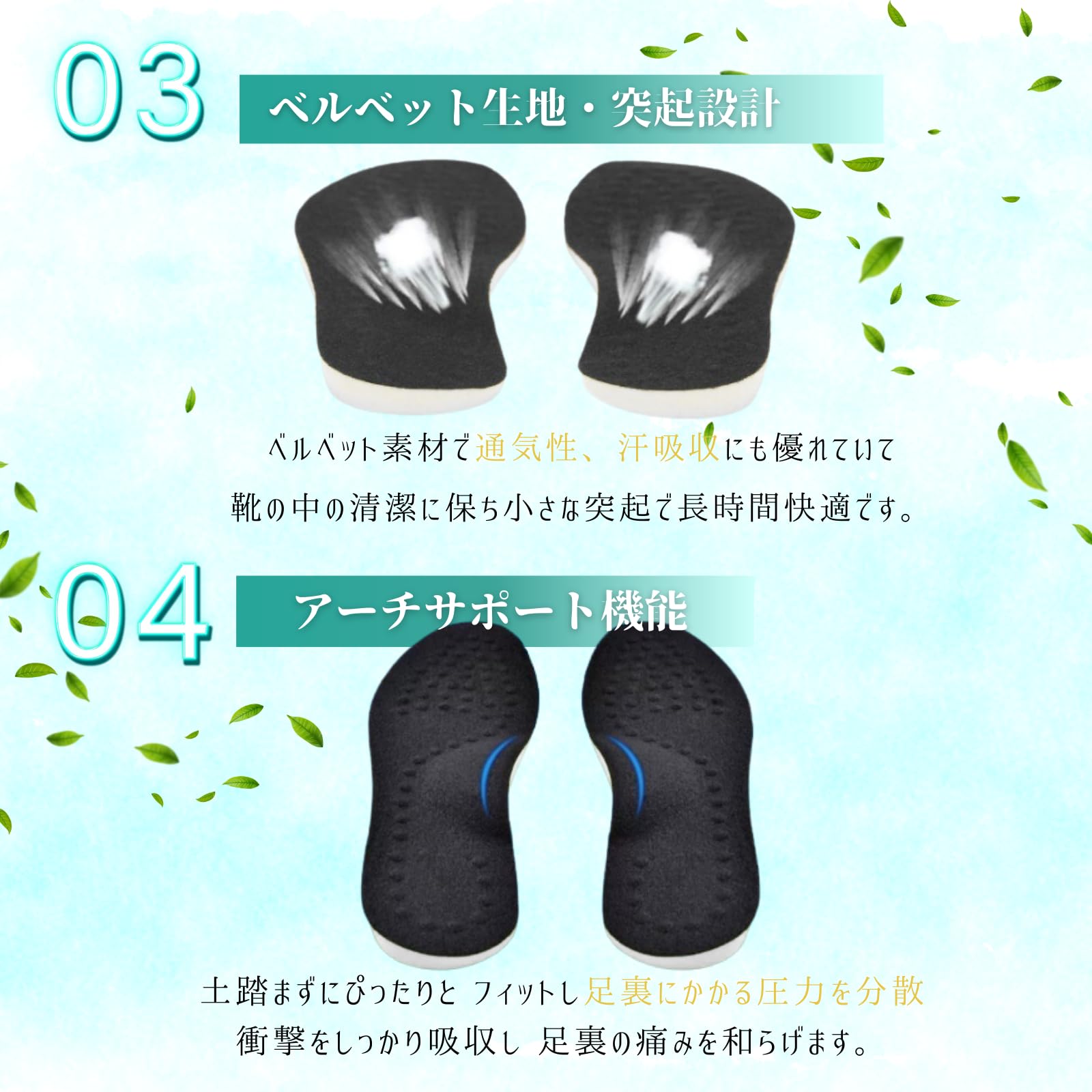 ?【衝撃吸収効果】表面は肌に優しいベルベット素材を採用し、通気性と汗吸吸収性が優しいです。ソールは快適なポリウレタン素材を使用しており、体重を支え、衝撃や摩擦から足裏を保護します。よく歩く人や立ち仕事が多い人に最適!