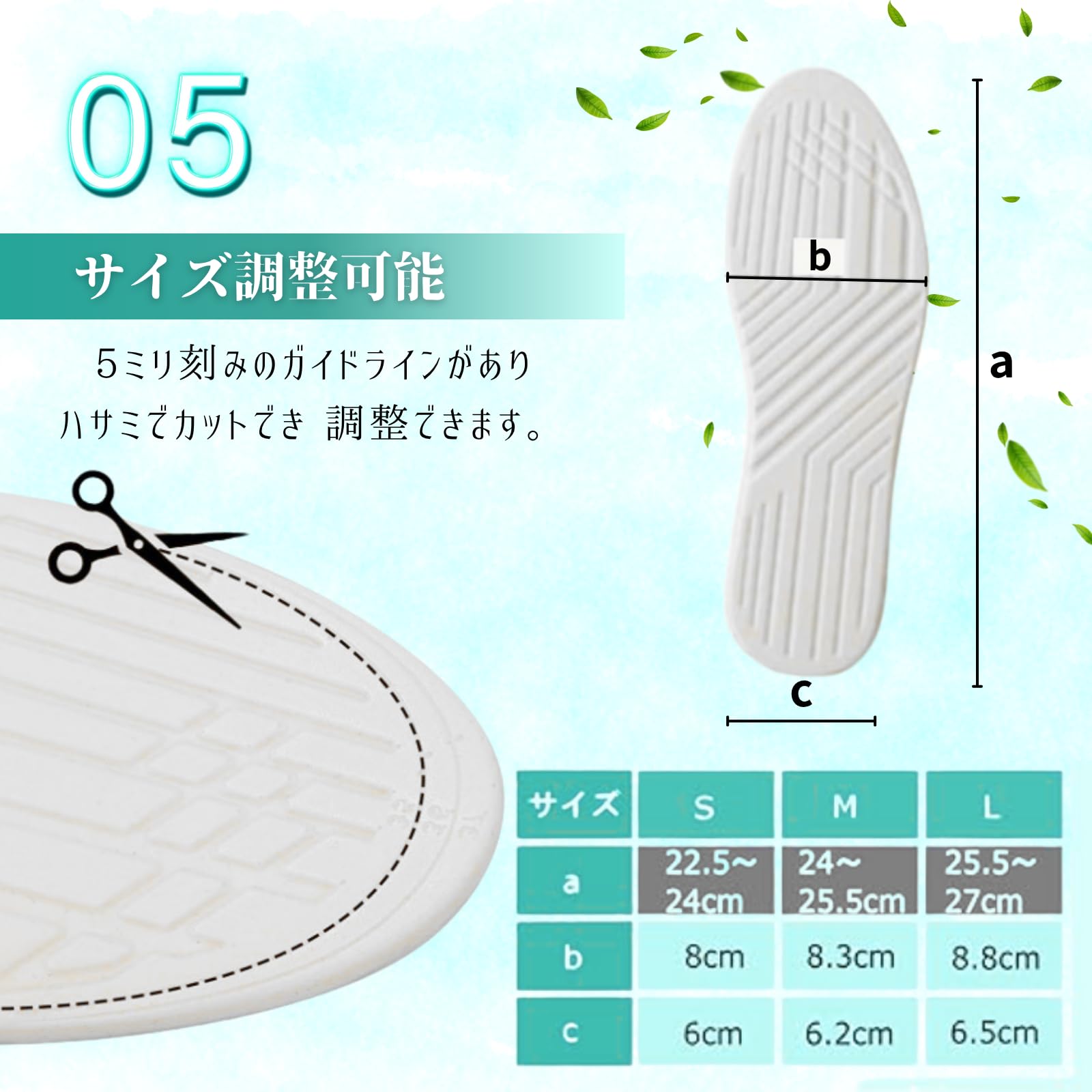 ?【様々な利用シーン】インソールの人間工学設計は悪い歩行癖を効果的。柔らかい素材は衝撃を吸収して,立ち仕事や外歩きの多い方、スポーツにまで幅広く使用して頂けます!底の薄い靴、スニーカー、ランニングシューズ、ブーツ、ショートブーツ、革靴、安全靴などにも適します。