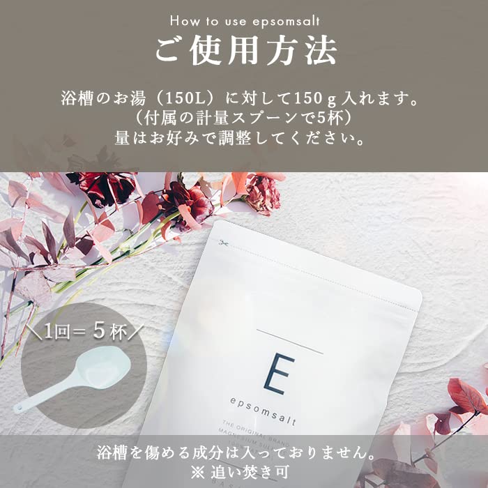 ご使用方法 。浴槽のお湯(150L)に対して150g入れてます。(付属の計量スプーンで5杯)量はお好みで調整してください。
