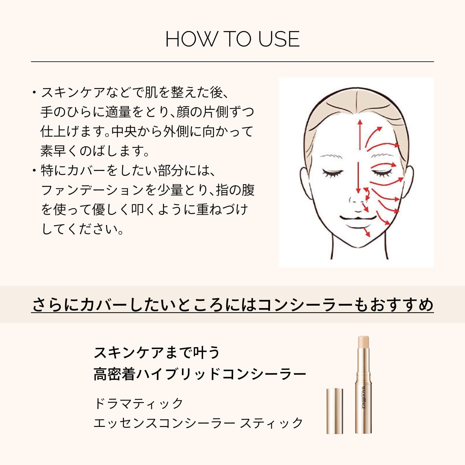 スキンケアなどで肌を整えた後、手のひらに適量をとり、顔の片側ずつ仕上げます。中央から外側に向かって素早くのばします。 特にカバーをしたい部分には、ファンデーションを少量とり、指の腹を使って優しく叩くように重ねづけしてください。 使い始めは、中味が出るまでディスペンサーを数回押してください。 使用量が少ないと、十分な紫外線防御効果が得られません。 紫外線防御効果のある化粧下地などとの併用をおすすめします。